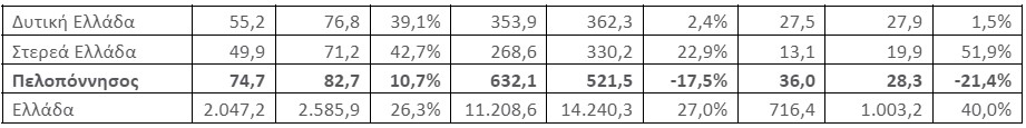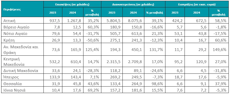 Η μεγαλύτερη ποσοστιαία αύξηση των διανυκτερεύσεων καταγράφηκε στην Ανατολική Μακεδονία και Θράκη (131,7%) και ακολουθούν η Θεσσαλία (98,6%) και η Αττική (39,1%). Σε απόλυτους αριθμούς η μεγαλύτερη αύξηση διανυκτερεύσεων καταγράφηκε στην Αττική (2.271.100 περισσότερες από πέρυσι) και ακολουθούν η Κεντρική Μακεδονία (394.300 περισσότερες από πέρυσι) και η Ανατολική Μακεδονία και Θράκη (255.800 περισσότερες από πέρυσι).