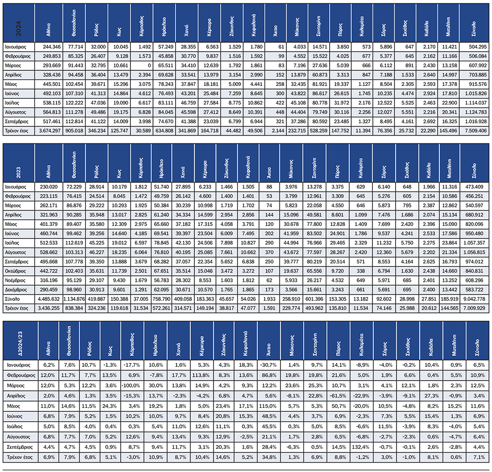 Σε απόλυτους αριθμούς το πρώτο εννεάμηνο του 2024 αφίχθηκαν στον Αερολιμένα Καλαμάτας 11.394 επιβάτες πτήσεων εσωτερικού ενώ πέρσι είχαν αφιχθεί 11.534.
