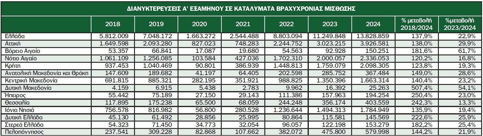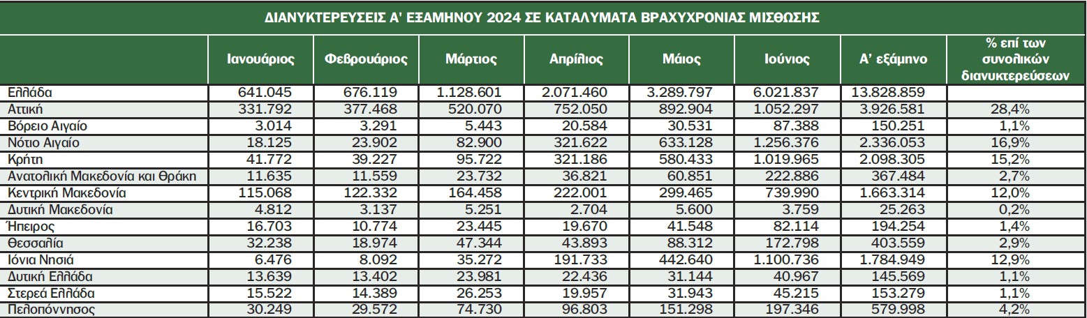 Συνολικά για την Ε.Ε. ανακοινωθήκαν χθες από τη Eurostat οι διανυκτερεύσεις του τρίτου τριμήνου του 2024. Κατά το τρίτο τρίμηνο του 2024, καταγράφηκαν 366,2 εκατ. διανυκτερεύσεις σε καταλύματα βραχυπρόθεσμης ενοικίασης στην ΕΕ. Τον Ιούλιο του 2024, καταγράφηκαν 135 εκατ. διανυκτερεύσεις, αύξηση 16,4% σε σύγκριση με τον Ιούλιο του 2023. Τον Αύγουστο καταγράφηκαν 152,2 εκατομμύρια διανυκτερεύσεις που κρατήθηκαν μέσω πλατφορμών ( αύξηση 21,6% σε σύγκριση με τον Αύγουστο του 2023) και τον Σεπτέμβριο 79 εκατ. (αύξηση 4% σε σύγκριση με τον Σεπτέμβριο του 2023) .