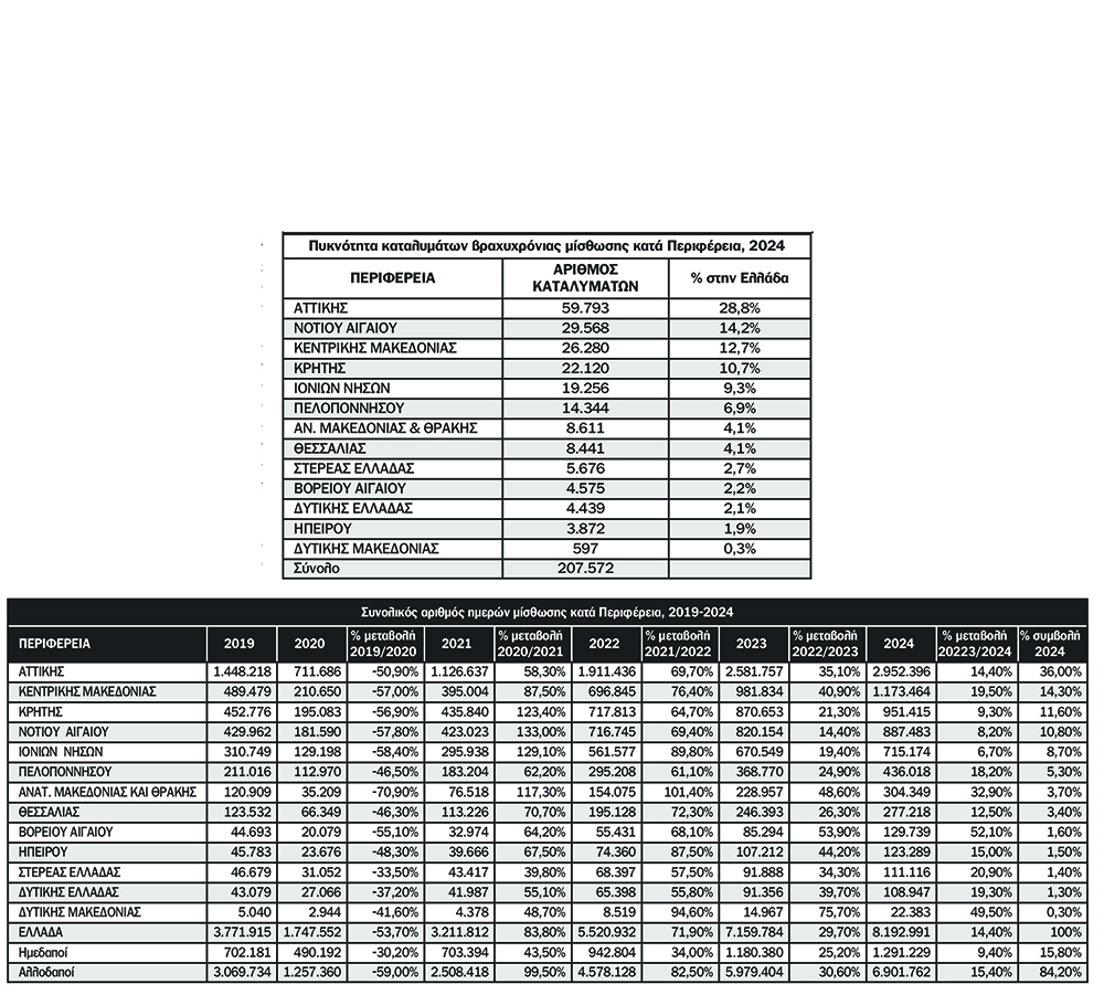 στην Ελλάδα και σε αυτά πραγματοποιήθηκε το 5,3 των πανελλήνιων ενοικιάσεων. Από τα στοιχεία κατά Περιφέρεια για το ίδιο έτος, με βάση τον αριθμό εγγραφών στο Μητρώο Ακινήτων Βραχυχρόνιας Μίσθωσης, υψηλότερη συγκέντρωση των εν λόγω καταλυμάτων παρατηρείται στις Περιφέρειες Αττικής (59.793), Νοτίου Αιγαίου ( 29.568), Κεντρικής Μακεδονίας (26.180) και Κρήτης(22.120). Κατά απόλυτες τιμές των ημερών μίσθωσης, μεγαλύτερη αύξηση το 2024 σε σύγκριση με το 2023, παρουσιάζουν οι Περιφέρειες Αττικής (μεταβολή 14,4%), Κεντρικής Μακεδονίας (μεταβολή 19,5%) και Κρήτης (μεταβολή 9,3%). Μεγαλύτερη συμβολή στο σύνολο των ημερών μίσθωσης κατά το 2024 παρατηρείται από τις Περιφέρειες Αττικής (36,0%), Κεντρικής Μακεδονίας (13,8%) και Κρήτης (12,1%). Το μεγαλύτερο μερίδιο των ημερών μίσθωσης που πραγματοποιήθηκε σε καταλύματα βραχυχρόνιας μίσθωσης με έτος αναφοράς 2024 αναλογεί σε αλλοδαπούς και ανέρχεται σε 84,2% των ημερών.