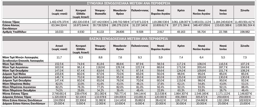 Συγκεκριμένα και σύμφωνα με τα στοιχεία του Ξενοδοχειακού Επιμελητηρίου της Ελλάδας, το 2024 στην Πελοπόννησο ο μέσος τζίρος των ξενοδοχείων ήταν 544.144 ευρώ ενώ πανελλαδικά άγγιξε τα 1.146.827 ευρώ. Το μεγαλύτερο μέσο τζίρο είχαν τα ξενοδοχεία στην Αττική (2.744.661 ευρώ), στην Κρήτη (1864.307 ευρώ) και στα Νησιά Νοτίου Αιγαίου (1.546.160 ευρώ). Ο συνολικός τζίρος των ξενοδοχείων της Πελοποννήσου διαμορφώθηκε στα 473,9 εκατ. ευρώ (4,1% του πανελλαδικού) και στην Ελλάδα στα 11. δισ. ευρώ . Το μεγαλύτερο συνολικό τζίρο είχαν τα ξενοδοχεία στο Νότιο Αιγαίο (3,4 δισ. ευρώ) στην Κρήτη (3,1 δισ. ευρώ) και Αττική (1,4 δισ. ευρώ). Τα μισά ξενοδοχεία της Πελοποννήσου είχαν συνολικά έσοδα κάτω από 153.891 ευρώ ενώ ο πανελλαδικός διάμεσος κύκλος εργασιών είναι 250.000ευρώ. Το μέσο ετήσιο κόστος των επενδύσεων στα ξενοδοχεία της Πελοποννήσου ήταν 35.862 ευρώ και το μέσο πανελλαδικό 102.632 ευρώ. Το μεγαλύτερο κόστος επενδύσεων καταγράφηκε στο Νότιο Αιγαίο (154.662 ευρώ), στα Ιόνια Νησιά (132.139 ευρώ) και στην Κρήτη (126.173 ευρώ).
