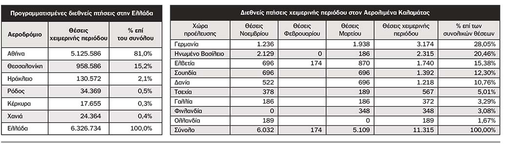 Όνειρο θερινής νύχτας παραμένει η επέκταση της τουριστικής σεζόν τον χειμώνα, καθώς από τον Νοέμβριο μέχρι και τον Μάρτιο στον Αερολιμένα Καλαμάτας είναι προγραμματισμένες μόλις 11.315 διεθνείς θέσεις, την ώρα που συνολικά στην Ελλάδα οι θέσεις της χειμερινής περιόδου ανέρχονται σε 6,3 εκατ.. Τα επίσημα στοιχεία αποτυπώνουν το σημερινό μέτρο της ζήτησης και δείχνουν πόσο μεγάλη απόσταση χωρίζει τη Μεσσηνία από την πραγματική καθιέρωση χειμερινού τουρισμού.