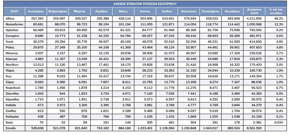 Σημαντική υποχώρηση κατέγραψε η επιβατική κίνηση εσωτερικού στο Αεροδρόμιο Καλαμάτας «Καπετάν Βασίλης Κωνσταντακόπουλος» στο διάστημα Ιανουαρίου – Οκτωβρίου 2025, σύμφωνα με τα στοιχεία της Υπηρεσίας Πολιτικής Αεροπορίας. Στο πρώτο δεκάμηνο αποβιβάστηκαν 10.159 επιβάτες εσωτερικού, αριθμός μειωμένος κατά 25,3% σε σχέση με την περσινή περίοδο, όταν είχαν καταγραφεί 12.150 αφίξεις.