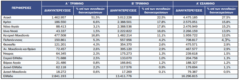 Οι διανυκτερεύσεις αυτές αντιστοιχούν στο 4,3% των συνολικά 16,2 εκατομμυρίων που καταγράφηκαν στην Ελλάδα. Σύμφωνα με τη Eurostat oι πιο δημοφιλείς περιοχές για βραχυπρόθεσμη μίσθωση καταλυμάτων που κρατήθηκαν μέσω διαδικτυακών πλατφορμών το δεύτερο τρίμηνο του 2025 ήταν η Ανδαλουσία (13,3 εκατομμύρια διανυκτερεύσεις) στην Ισπανία, η Γιαντράνσκα Χρβάτσκα (9,6 εκατομμύρια) στην Κροατία και το Ιλ ντε Φρανς (9,0 εκατομμύρια) στη Γαλλία.