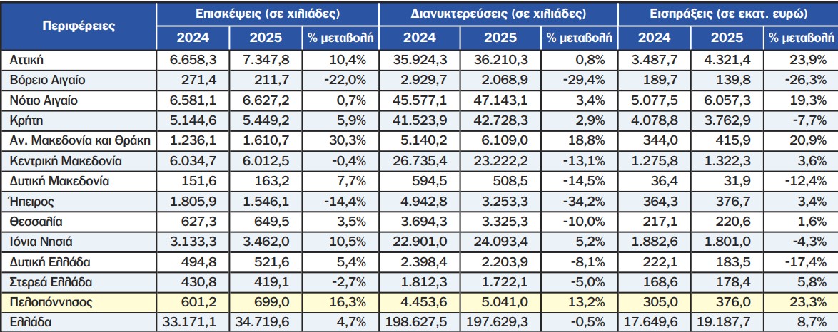 Τα στοιχεία αποτυπώνουν μια τουριστική εικόνα με έντονες περιφερειακές διαφοροποιήσεις, με την Πελοπόννησο να ξεχωρίζει κυρίως στο σκέλος των εσόδων. Περισσότερα στοιχεία παρουσιάζονται στον πίνακα: