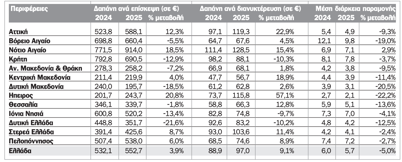 Συγκεκριμένα και σύμφωνα με τα στοιχεία της Τράπεζας της Ελλάδας η μέση δαπάνη ανά επίσκεψη στην Περιφέρεια Πελοποννήσου αυξήθηκε από 507,4 ευρώ το 2024 σε 538 ευρώ το 2025. Στην Ελλάδα αυξήθηκε από 532,1 ευρώ το 2024 σε 552,7 το 2025. Η μεγαλύτερη μέση δαπάνη ανά επίσκεψη το 2025 καταγράφηκε στο Νότιο Αιγαίο (914 ευρώ) και η μικρότερη στη Δυτική Μακεδονία (195,7 ευρώ).