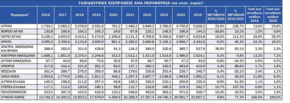 Σε βάθος δεκαετίας η Περιφέρεια κατέγραψε αύξηση 32,5%, από 323,5 εκατ. ευρώ το 2016 στα 428,7 εκατ. ευρώ το 2025. Την ίδια περίοδο, όμως, η χώρα κινήθηκε με υπερδιπλάσιο ρυθμό, καθώς οι συνολικές ταξιδιωτικές εισπράξεις αυξήθηκαν κατά 77,3%.
