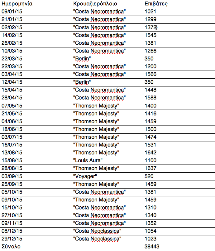 Στον πίνακα παρουσιάζονται τα κρουαζιερόπλοια που έπιασαν το λιμάνι της Καλαμάτας το 2015 και ο αριθμός των επιβατών.