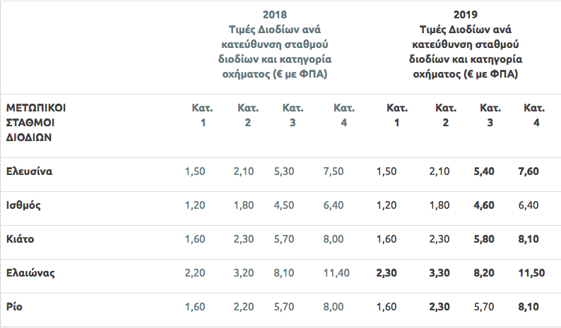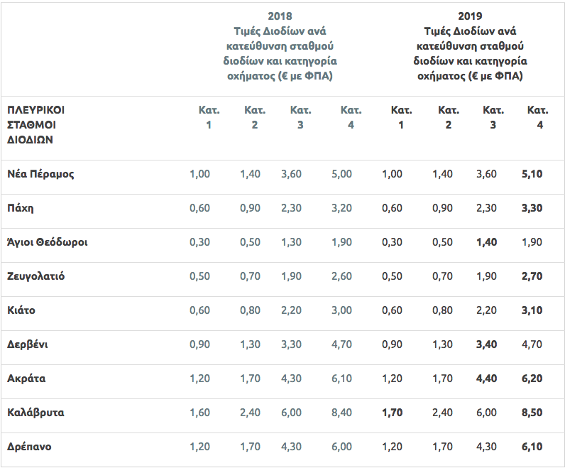 Αναλυτικά οι τιμές όλων των διοδίων ανά σταθμό διοδίων και κατηγορία οχήματος διαμορφώνονται ως εξής (με έντονους χαρακτήρες οι τιμές που αλλάζουν):