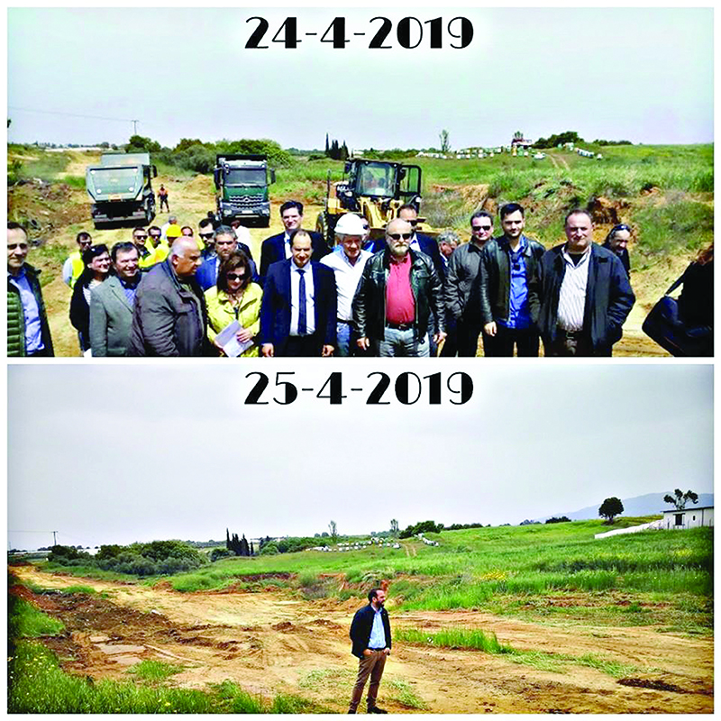 Χθες στο ίδιο σημείο φωτογραφήθηκε ο "γαλάζιος" υποψήφιος περιφερειάρχης Δυτικής Ελλάδας Νεκτάριος Φαρμάκης και όπως φαίνεται στη φωτογραφία που ανάρτησε ο περιφερειακός σύμβουλος Νίκος Χαρδαλιάς, δεν υπάρχει ούτε ίχνος μηχανήματος και φυσικά κανένα εργοτάξιο.