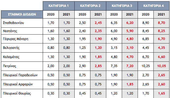 Ο νέος τιμοκατάλογος περιλαμβάνει ΦΠΑ 24% και θα ισχύει για όλους τους μετακινούμενους, συμπεριλαμβανομένων των κατόχων ηλεκτρονικών πομποδεκτών.