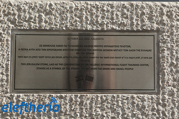 Η εκδήλωση ολοκληρώθηκε με την παρουσίαση της τιμητικής πλακέτας με συμβολική επιγραφή στα ελληνικά, τα εβραϊκά και τα αγγλικά, όπου αναγράφει: «Ως θεμέλιος λίθος για το ελληνικό Διεθνές Κέντρο Εκπαίδευσης Πιλότων, η πέτρα αυτή από την Ιερουσαλήμ αποτελεί σύμβολο των ισχυρών δεσμών μεταξύ των λαών της Ελλάδας και του Ισραήλ».