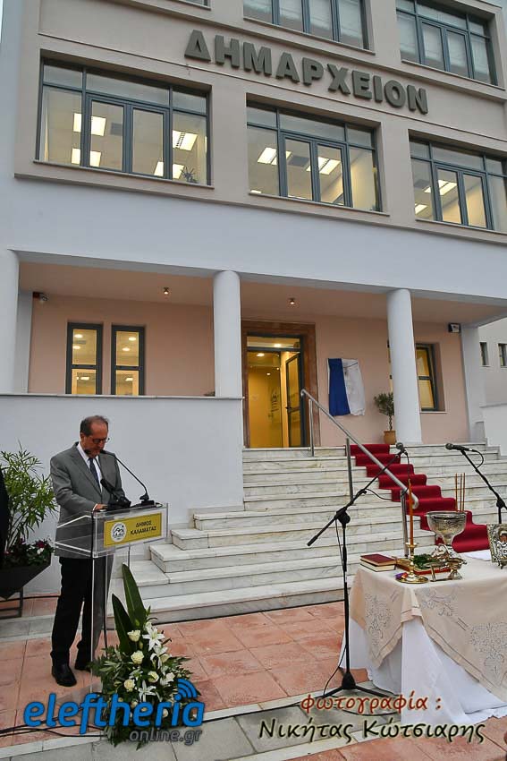 Ο δήμαρχος Καλαμάτας Παναγιώτης Νίκας, φανερά συγκινημένος, υπενθύμισε ότι η χρηματοδότηση κατασκευής του νέου Δημαρχείου ενεγράφη σε ΣΑΕ από τον Προκόπη Παυλόπουλο, όταν ήταν υπουργός Εσωτερικών, και χρηματοδοτήθηκε στη συνέχεια από όλους τους υπουργούς Εσωτερικών με συνολικό κόστος 3,5 εκ. ευρώ. Ανέφερε ότι η μελέτη ήταν δωρεά του ευεργέτη καπετάν Βασίλη Κωνσταντακόπουλου και παρατήρησε πως το νέο Δημαρχείο έχει ήδη αποσπάσει δύο πανελλήνια βραβεία, για την πρωτοτυπία και την περιβαλλοντική του ευαισθησία.