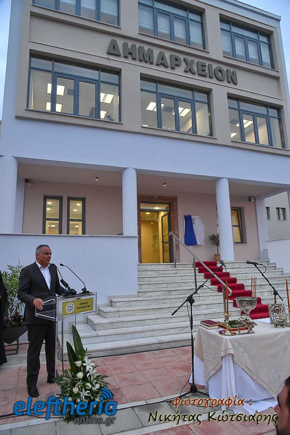 Επεσήμανε, ακόμα, πως “το νέο Δημαρχείο θα διευκολύνει όλα τα όργανα του δήμου να αρθούν στο ύψος των περιστάσεων κατά την επιτέλεση της αποστολής τους, ιδίως μάλιστα σ’ αυτή την δύσκολη περίοδο για το κοινωνικό σύνολο, που χειμάζεται από την βαθιά κοινωνική και οικονομική κρίση”. Υπενθύμισε ότι “το ίδιο το Σύνταγμα κατοχυρώνει τη διοικητική και οικονομική αυτοτέλεια των Οργανισμών Τοπικής Αυτοδιοίκησης, τον καίριο θεσμικό και πολιτικό ρόλο τους. Και το Κράτος, και κυρίως η Εκτελεστική Εξουσία, οφείλει όχι μόνο να σέβεται την αυτοτέλεια αυτή, αλλά να συμβάλλει ενεργώς στην εμπέδωσή της στην πράξη”. Και παρατήρησε ότι “οι Οργανισμοί Τοπικής Αυτοδιοίκησης έχουν στηρίξει και στηρίζουν, μέσα σ' αυτή τη δεινή συγκυρία, βασικές πτυχές του κοινωνικού κράτους, συμβάλλοντας έτσι στην αποτροπή ρήξης του κοινωνικού ιστού. Και το έχουν πράξει με πολύ λιγότερα μέσα, οικονομικά αλλά και μέσα υλικοτεχνικής υποδομής, από εκείνα που θα έπρεπε να έχουν στην διάθεσή τους, προκειμένου ν' αντεπεξέλθουν σ' ένα τόσο βαρύ κοινωνικό -και όχι μόνο- καθήκον”.
