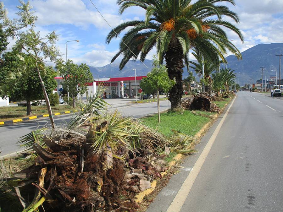 Ξεριζώνουν τους κατεστραμμένους φοίνικες στη Νέα Είσοδο Καλαμάτας και στη θέση τους θα μπουν πλατάνια.