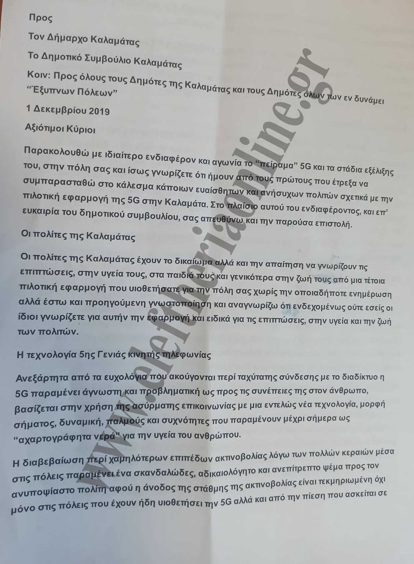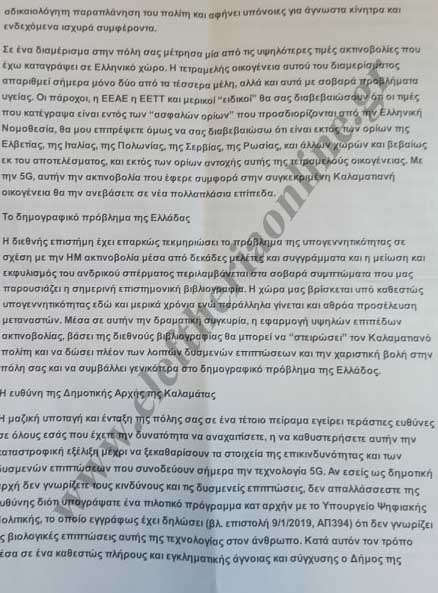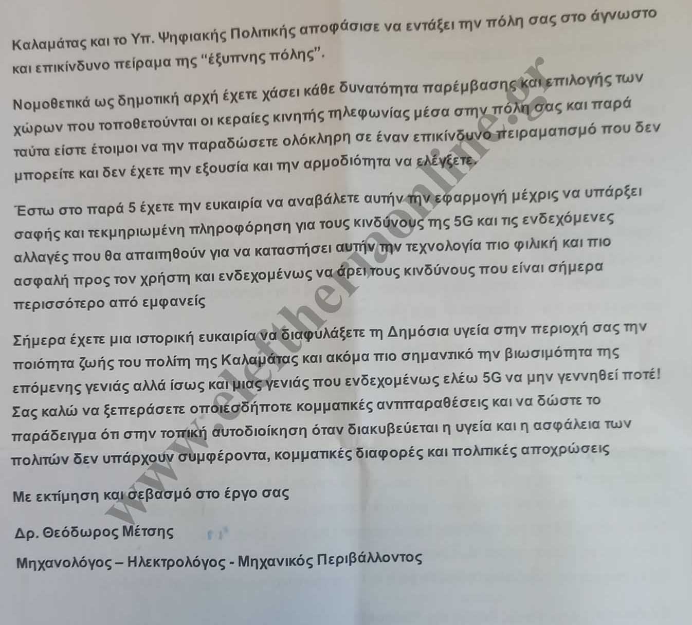 Και η επιστολή καταλήγει με έκκληση προς τους δημοτικούς συμβούλους: «Σήμερα έχετε μία ιστορική ευκαιρία να διαφυλάξετε τη δημόσια υγεία στην περιοχή σας, την ποιότητα ζωής του πολίτη της Καλαμάτας και ακόμα πιο σημαντικό τη βιωσιμότητα της επόμενης γενιάς, αλλά ίσως και μια γενιάς που ενδεχομένως ελέω 5G να μην γεννηθεί ποτέ».