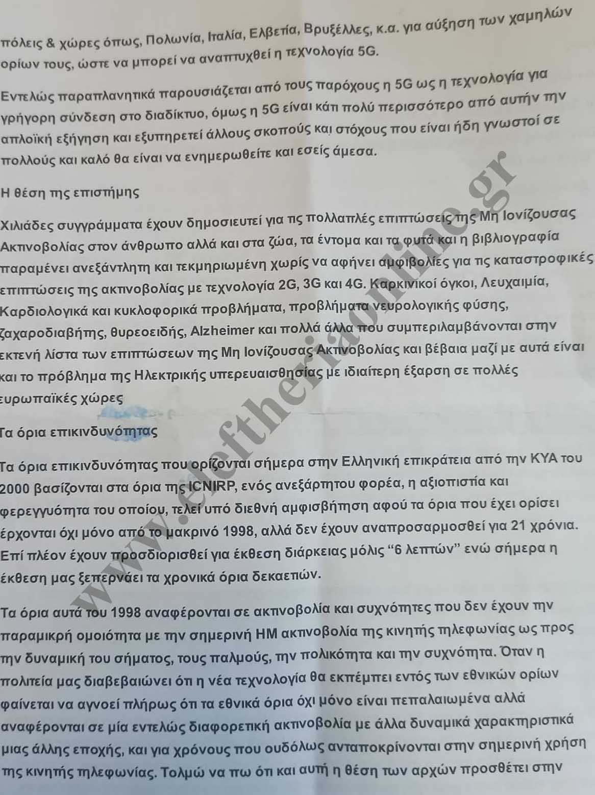 Για του λόγου το ασφαλές, αναδημοσιεύουμε αυτούσια αποσπάσματα της επιστολής που αναγνώσθηκε, χωρίς μάλιστα αντίλογο, του δρα Θεόδωρου Μέτση, ο οποίος πρωτοστατεί στο αγώνα κατά των κινητών. Ο Θ. Μέτσης θέλει να καταργηθούν όλα τα δίκτυα - και αναφέρει επί λέξει: «Χιλιάδες συγγράμματα έχουν δημοσιευτεί για τις πολλαπλές επιπτώσεις της μη ιονίζουσας ακτινοβολίας στον άνθρωπο αλλά και στα ζώα, τα έντομα και τα φυτά και η βιβλιογραφία παραμένει ανεξάντλητη και τεκμηριωμένη χωρίς να αφήνει αμφιβολίες για τις καταστροφικές επιπτώσεις ακτινοβολίας με τεχνολογία 2G, 3G και 4G».