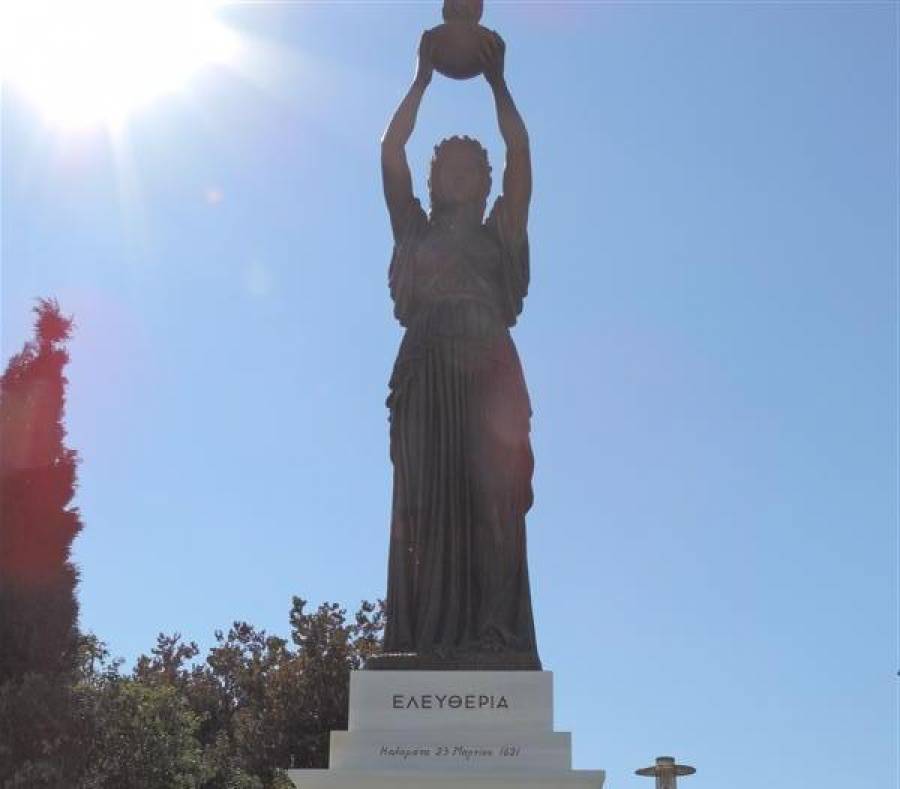 Ο δήμαρχος επεσήμανε ότι «σ’ αυτόν τον ηρωικό και τιμημένο τόπο ξεκίνησε η Επανάσταση του 1821 και ο αγώνας για την ελευθερία και θα το συμβολίζει κάλλιστα αυτό το άγαλμα». Ευχαρίστησε για την προσφορά της τη δωρήτρια Ιολάνδη Παπαδοπούλου, που δώρισε αυτό το άγαλμα «για να κοσμεί την πόλη της ελευθερίας και να συμβολίζει ότι από εδώ ξεκίνησε ο αγώνας του 1821». Συνεχάρη, επίσης, τον γλύπτη και καθηγητή Καλών Τεχνών Νίκο Ι. Γεωργίου, για την πετυχημένη δημιουργία του.