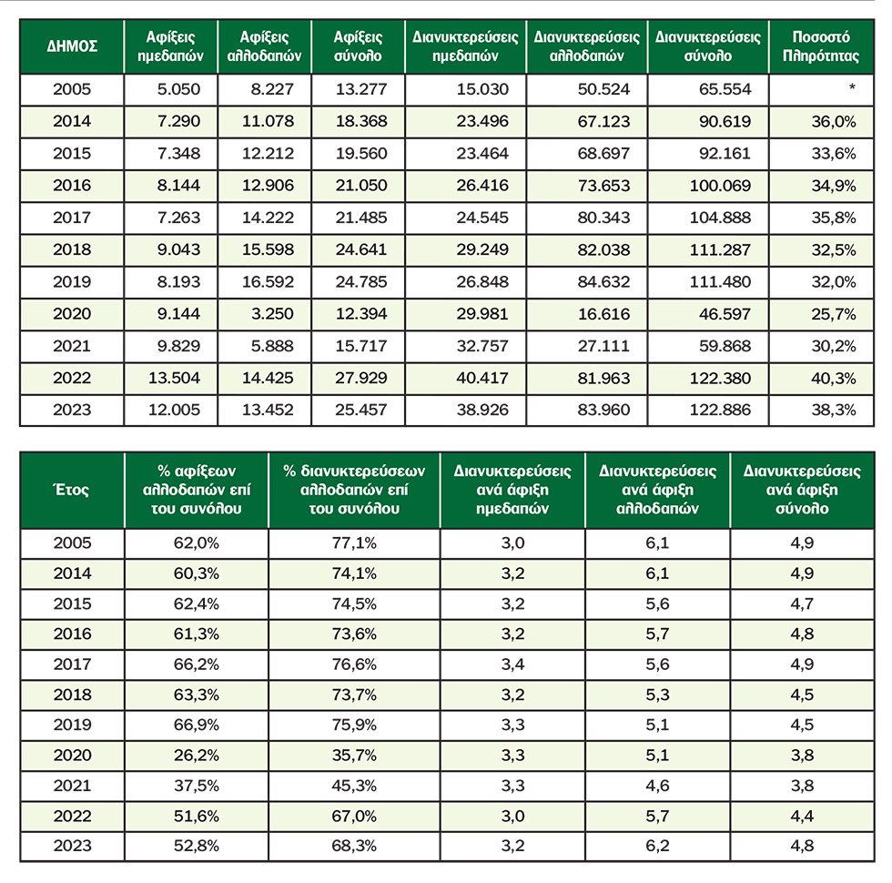 Οι περισσότερες αφίξεις (27.929) στα ξενοδοχεία του Δήμου Δυτικής Μάνης καταγράφηκαν το 2022 και οι περισσότερες διανυκτερεύσεις (122.886) πέρσι το 2023. Αξίζει να σημειωθεί ότι οι αφίξεις Ελλήνων ταξιδιωτών στα ξενοδοχεία του Δήμου Δυτικής Μάνης ξεπέρασαν τις 10.000 μόλις το 2022. Μέχρι τότε οι αφίξεις και οι διανυκτερεύσεις αλλοδαπών επί του συνόλου των επισκεπτών ξεπερνούσαν το 60%. Το ποσοστό αυτό μειώθηκε δραματικά τα χρόνια της πανδημίας και το 2023 οι αφίξεις αλλοδαπών ήταν μόλις το 52,8% των συνολικών αφίξεων. Κανένας όμως δεν γνωρίζει αν θα συνεχιστεί η τάση των τελευταίων χρόνων για αύξηση των αφίξεων Ελλήνων στα ξενοδοχεία της Δυτικής Μάνης. Σε κάθε περίπτωση αξίζει να σημειωθεί ότι το 2023 καταγράφηκαν 6,2 αφίξεις ανά αλλοδαπό επισκέπτη και 3,2 διανυκτερεύσεις ανά Έλληνα επισκέπτη