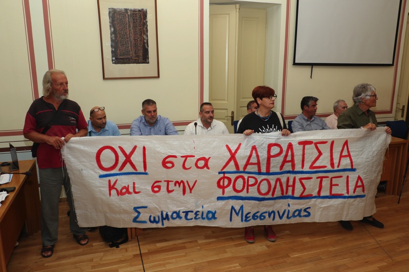 Νωρίτερα εκπρόσωποι εργατικών σωματείων και συνταξιούχων πραγματοποίησαν συγκέντρωση διαμαρτυρίας έξω από το Ιστορικό Δημαρχείο. Αρκετοί από αυτούς βρέθηκαν στην συνέχεια στην αίθουσα συνεδριάσεων για να παρακολουθήσουν το Δημοτικό Συμβούλιο και εξέφρασαν την αντίθεσή τους στην αύξηση των τελών.