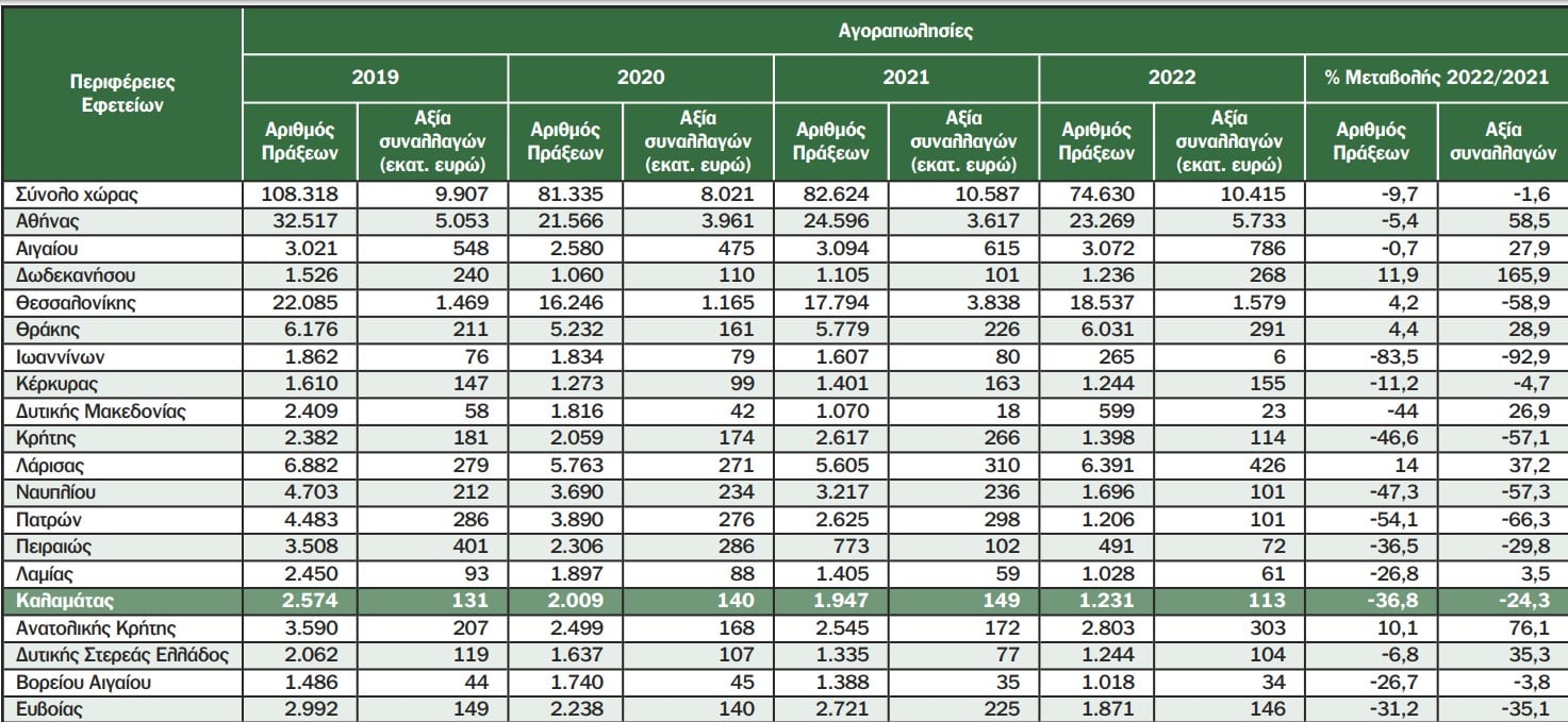 Μείωση 36,8% στις πράξεις αγοραπωλησίας και μείωση 24,3% στην αξία των συναλλαγών καταγράφηκε το 2022 σε σχέση με το προηγούμενο έτος, στα Υποθηκοφυλακεία του Εφετείου Καλαμάτας.