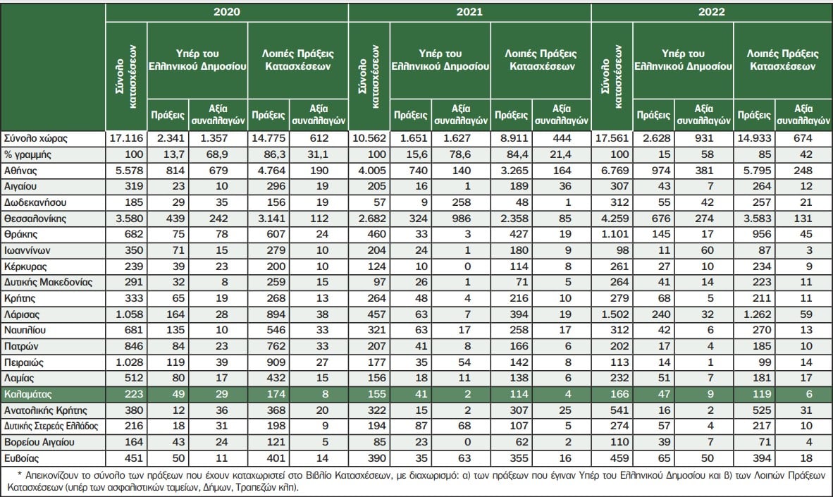 Αντιθέτως καταγράφηκε αύξηση 7% στις πράξεις κατασχέσεων και 150% στην αξία των κατασχέσεων. Συγκεκριμένα η Ελληνική Στατιστική Αρχή το 2022 στα Υποθηκοφυλακεία του Εφετείου Καλαμάτας κατέγραψε 113 πράξεις αγοραπωλησίας ( 129 την προηγούμενη χρονιά) αξίας συναλλαγών 113 εκατ. ευρώ (149 εκατ. ευρώ την προηγούμενη χρονιά). Το 2022 καταγράφηκαν επίσης 166 πράξεις κατάσχεσης (155 το προηγούμενο έτος) συνολικής αξίας 15 εκατ. ευρώ (6 εκατ. ευρώ το προηγούμενο έτος)