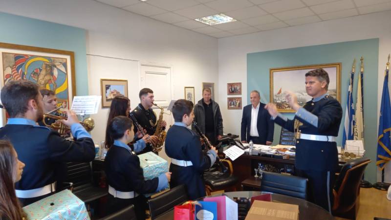 Τα παιδιά της Φιλαρμονικής συνοδευόμενα από το μαέστρο Γιάννη Σταθόπουλο βρέθηκαν το πρωί στο Δημαρχείο, όπου τους υποδέχθηκε ο δήμαρχος Παναγιώτης Καρβέλας, ο αντιδήμαρχος Γιώργος Κουφόγιωργας, αλλά και δημοτικοί υπάλληλοι.