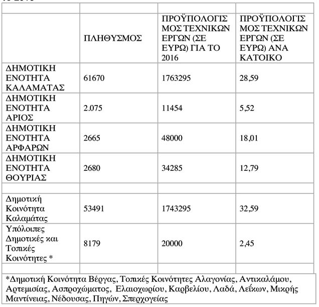 «Οι μόνιμα χαμένοι ήταν για μια ακόμα φορά οι κάτοικοι στη Βέργα, Αλαγονία, Αντικάλαμο, Αρτεμισία, Ασπρόχωμα, Ελαιοχώρι, Καρβέλι, Λαδά, Λέικα, Μικρή Μαντίνεια, Νέδουσα, Πηγές, Σπερχογεία, Αλώνια, Αμμο, Ανεμόμυλο, Αρι, Αριοχώρι, Ασπροπουλιά, Αγιο Φλώρο, Αγριλο, Αρφαρά, Βελανιδιά, Βρομόβρυση, Πήδημα, Πλατύ, Σταματινού, Αιθαία, Αμφεια, Ανθεια, Θουρία, Μικρομάνη, Πολιανή. Σε όλες αυτές τις περιοχές τα χρήματα που θα δαπανηθούν για τεχνικά έργα από το Δήμο Καλαμάτας θα είναι ελάχιστα όπως ξεκάθαρα απεικονίζεται στον παρακάτω πίνακα. Σε αυτόν τον πίνακα φαίνεται η ανισοκατανομή των διαθέσιμων για έργα πόρων εις βάρος των Δημοτικών Ενοτήτων Αριος, Αρφαρών και Θουρίας αφενός και εις βάρος των δημοτικών και τοπικών κοινοτήτων της Δημοτικής Ενότητας Καλαμάτας.