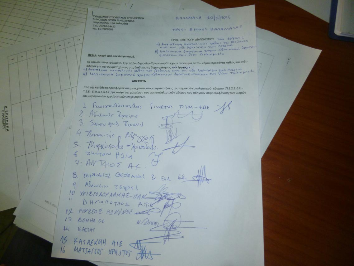 Εργολάβοι από τη Μεσσηνία και άλλες περιοχές είχαν συγκεντρωθεί στον 1ο όροφο του Διοικητηρίου Μεσσηνίας, μπροστά από τα γραφεία όπου θα γίνονταν οι δημοπρασίες και δεν κατέθεσαν προσφορές. Μετά τη διαδικασία 20 εργολάβοι υπέγραψαν κείμενο, με το οποίο δήλωναν πως απείχαν, συνεχίζοντας τις κινητοποιήσεις κατά του ασφαλιστικού, που ψηφίστηκε τα μεσάνυχτα της Κυριακής. Οι δημοπρασίες αφορούσαν το έργο ανάπλασης στην ανατολική όχθη του Νέδοντα και το γήπεδο στα Παλιάμπελα.