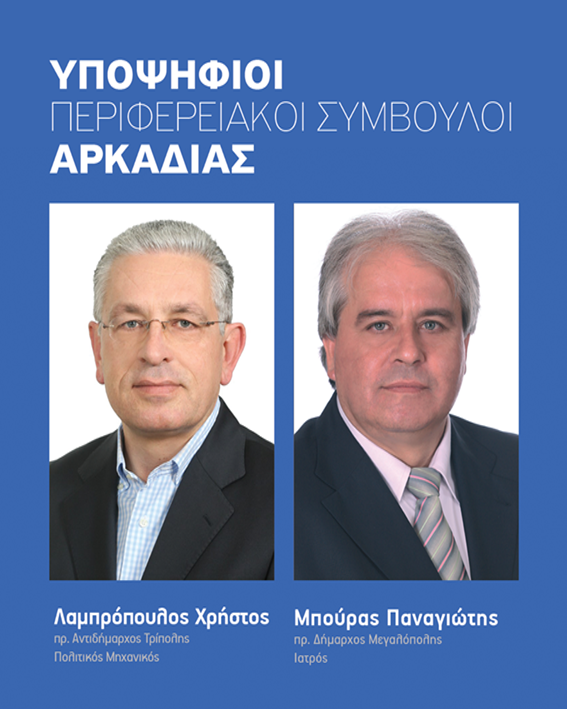 Υποψήφιοι περιφερειακοί σύμβουλοι στην Αρκαδία λοιπόν θα είναι ο πρώην αντιδήμαρχος Τρίπολης, πολιτικός μηχανικός Χρήστος Λαμπρόπουλος και ο πρώην δήμαρχος Μεγαλόπολης, γιατρός, Παναγιώτης Μπούρας.