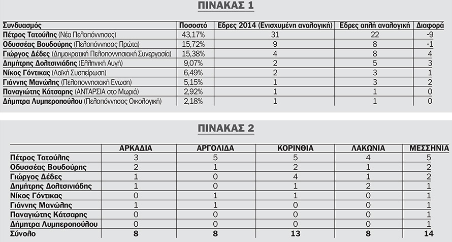 Υπενθυμίζουμε ότι ο εκλογικός νόμος προβλέπει τις εξής έδρες ανά περιφερειακή ενότητα: Αργολίδα 8, Αρκαδία 8, Λακωνία 8, Κορινθία, 13 και Μεσσηνία 14.