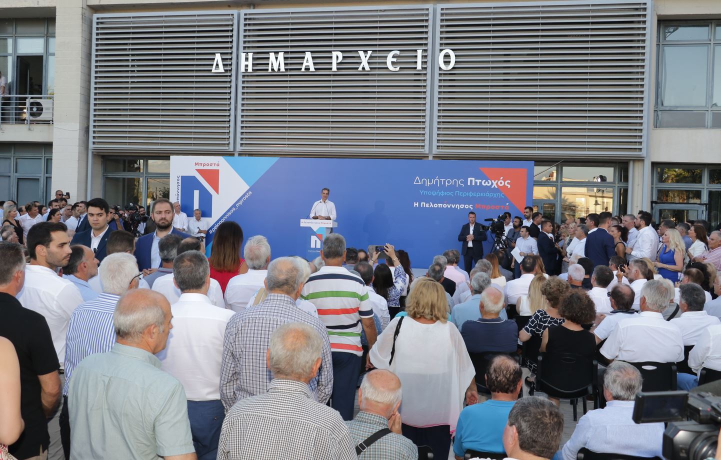 «Ο Δημήτρης Πτωχός είναι ένας άνθρωπος ο οποίος συνδυάζει -και αυτό δεν είναι πολύ συνηθισμένο- την τεχνοκρατική επάρκεια με το γνήσιο πάθος για την πολιτική ως μία διαρκή άσκηση της βελτίωσης της ποιότητας ζωής των πολιτών» δήλωσε λίγο νωρίτερα ο κ. Μητσοτάκης παρουσιάζοντας τον υποψήφιο περιφερειάρχη Πελοποννήσου. «Είμαι απολύτως πεπεισμένος ότι με τη στήριξη όλων σας και όλων μας, με τη στήριξη όλων των κομματικών μας στελεχών, αλλά όχι μόνο, ο Δημήτρης Πτωχός θα είναι ο επόμενος Περιφερειάρχης Πελοποννήσου» είπε στη συνέχεια της ομιλίας του ο πρωθυπουργός.