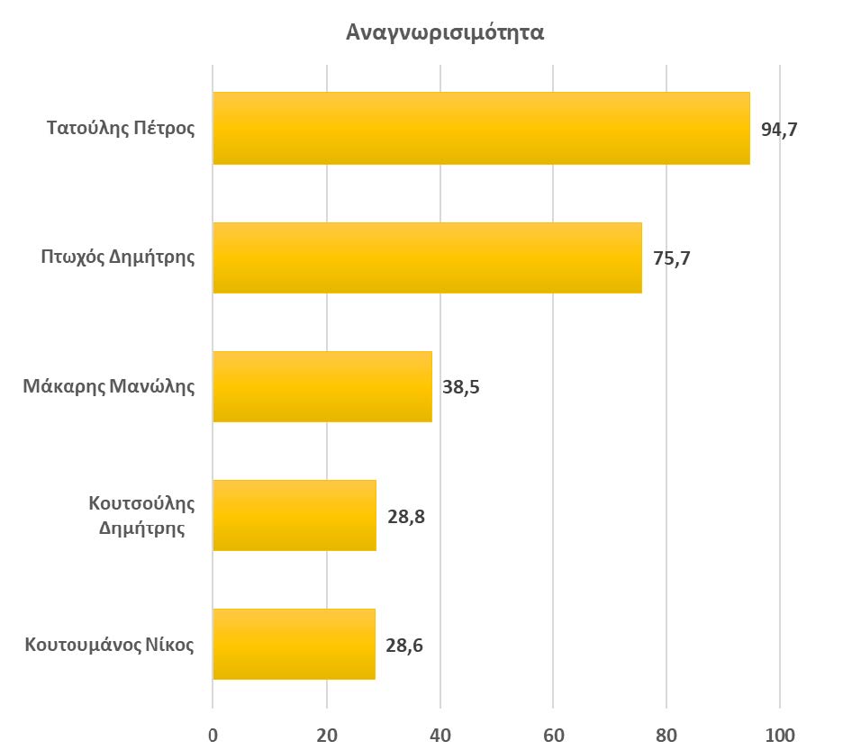 * Οι άλλοι τρεις υποψήφιοι ακολουθούν με μικρότερα ποσοστά αναγνωρισιμότητας με τον κ. Μ. Μάκαρη να καταγράφει βαθμό γνώσης 38,5%, τον κ. Δ. Κουτσούλη με 28,8% και τον κ. Ν. Κουτουμάνο με 28,6%.