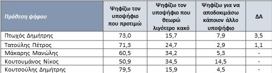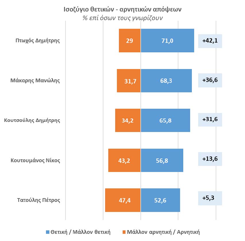 * Στην χρονική στιγμή διενέργειας της έρευνας ο κ. Πτωχός καταγράφει το καλύτερο ισοζύγιο θετικών – αρνητικών γνωμών με το 71% των ψηφοφόρων που τον γνωρίζουν να έχουν σχηματίσει θετική γνώμη για αυτόν ενώ το 29% αρνητική. Ακολουθεί ο κ. Μάκαρης με 68,3% θετικές γνώμες και 31,7% αρνητικές, μετά ο κ. Κουτσούλης με 65,8% θετικές και 34,2% αρνητικές γνώμες, ο κ. Κουτουμάνος με 56,8% θετικές και 43,2% αρνητικές.