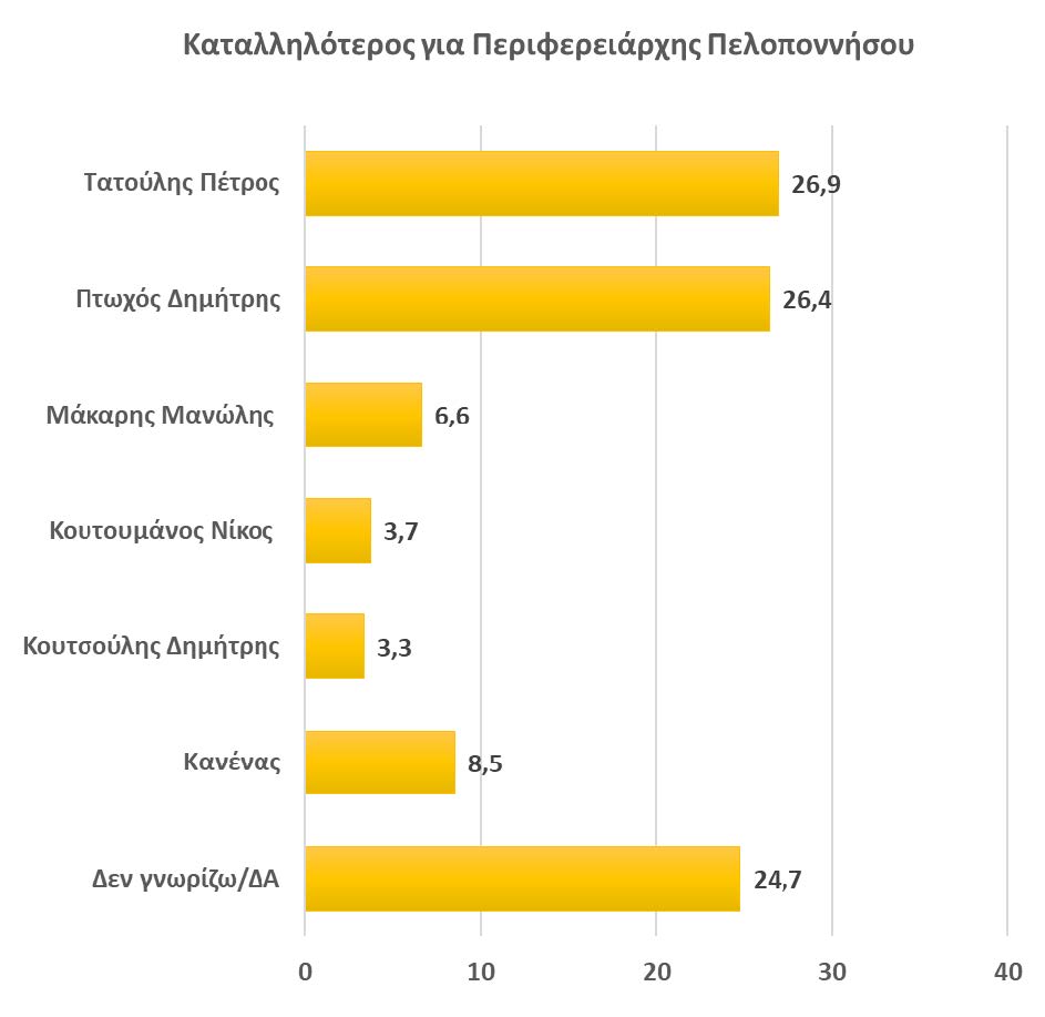 * Την χρονική στιγμή της δημοσκόπησης το εκλογικό σώμα της Περιφέρειας Πελοποννήσου μοιράζεται μεταξύ δύο υποψηφίων. Τον κ. Π. Τατούλη θεωρεί καταλληλότερο για τη θέση του περιφερειάρχη το 26,9% του εκλογικού σώματος και τον Δ. Πτωχό το 26,4%. Ένας ακόμα δείκτης από τον οποίο προκύπτει από την μια η σημαντική διείσδυση του Π. Τατούλη στο εκλογικό σώμα και από την άλλη ότι η υποψηφιότητά του κ. Π. Πτωχού έχει δυναμική.