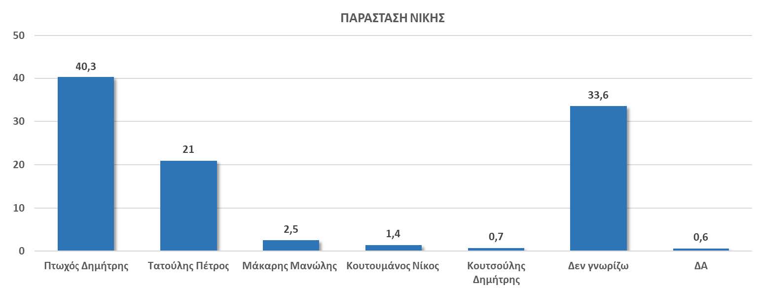 * Οι πολίτες της Περιφέρειας Πελοποννήσου σε ποσοστό 40,3% θεωρούν ότι θα κερδίσει τις εκλογές ο Δ. Πτωχός και μόλις σε ποσοστό 21% ότι θα κερδίσει ο Π. Τατούλης.