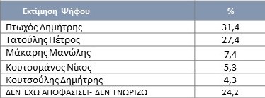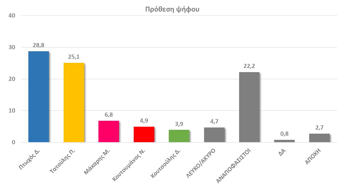 * Στον πρώτο γύρο ο Δ. Πτωχός θα λάμβανε ποσοστό 28,8% και ο Π. Τατούλης 25,1%. Ο Μ. Μάκαρης 6,8%, ο Ν. Κουτουμάνος 4,9% και ο Δ. Κουτσούλης 3,9%.