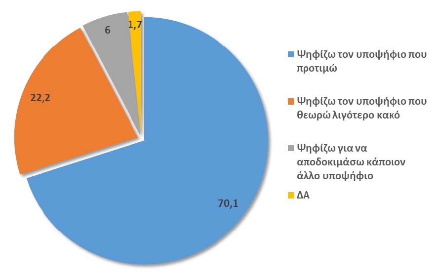 Από την ερώτηση: «ΕΑΝ ΕΧΕΙ ΑΠΟΦΑΣΙΣΕΙ ΠΟΙΟΝ ΘΑ ΨΗΦΙΣΕΙ: Μου είπατε ότι θα ψηφίσετε τον …… Επιλέγετε αυτό τον υποψήφιο επειδή τον προτιμάτε, επειδή είναι ο λιγότερο κακός, ή για να αποδοκιμάσετε κάποιον άλλο υποψήφιο; ;»