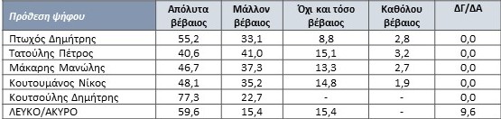 * Από δηλώσεις των αναποφάσιστων που ανέφεραν ότι είναι μεταξύ δύο υποψηφίων, με 50%-50% μοίρασμα των ψήφων, εκτιμάται ότι εάν γίνονταν αύριο οι εκλογές η πιθανότερη κατανομή των ψήφων των «αναποφάσιστων» θα ήταν 36,4% στον κ. Πτωχό, το 32,5% στον κ. Τατούλη, το 16,4% στον κ. Μάκαρη, το 9,96% στον κ. Κουτσούλη και το 4,76% στον κ. Κουτουμάνο.