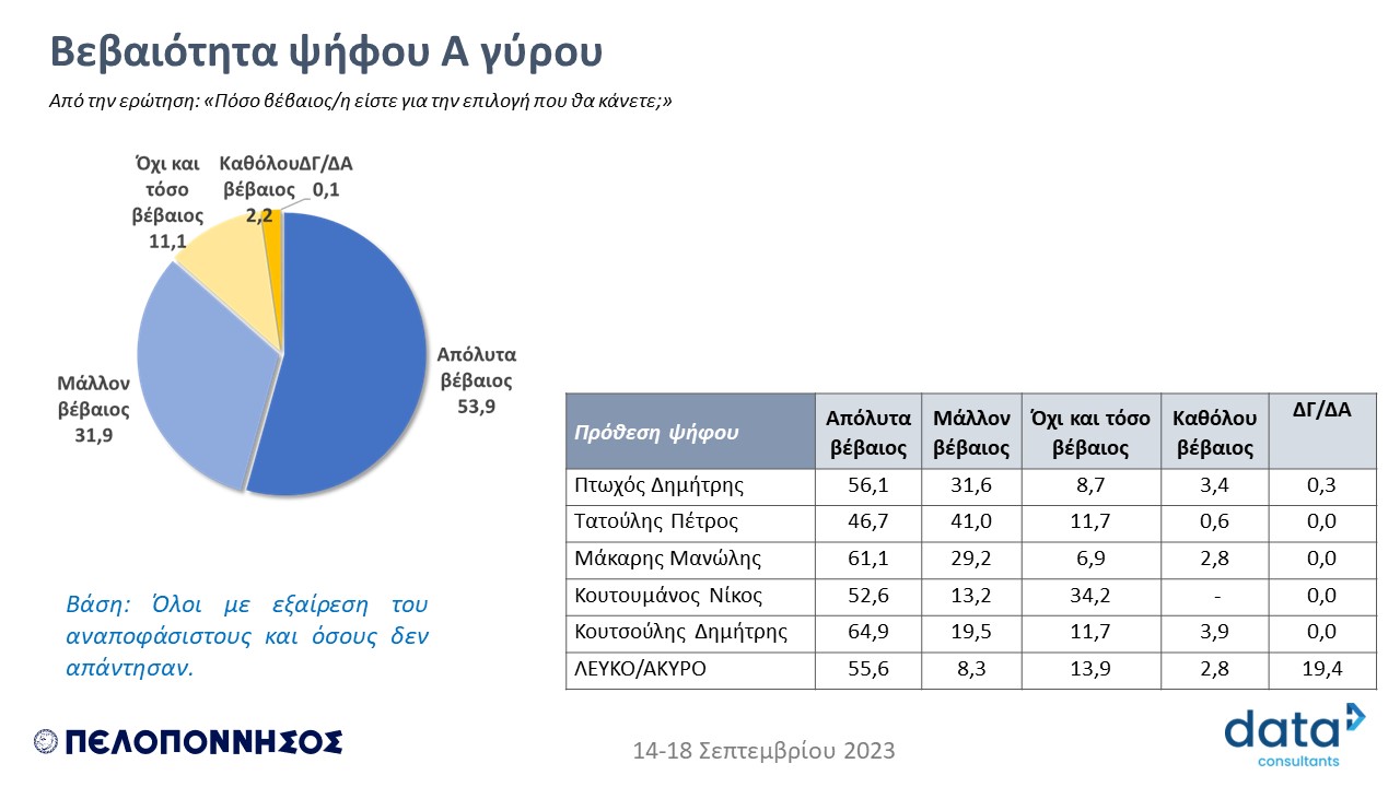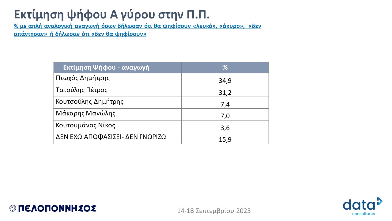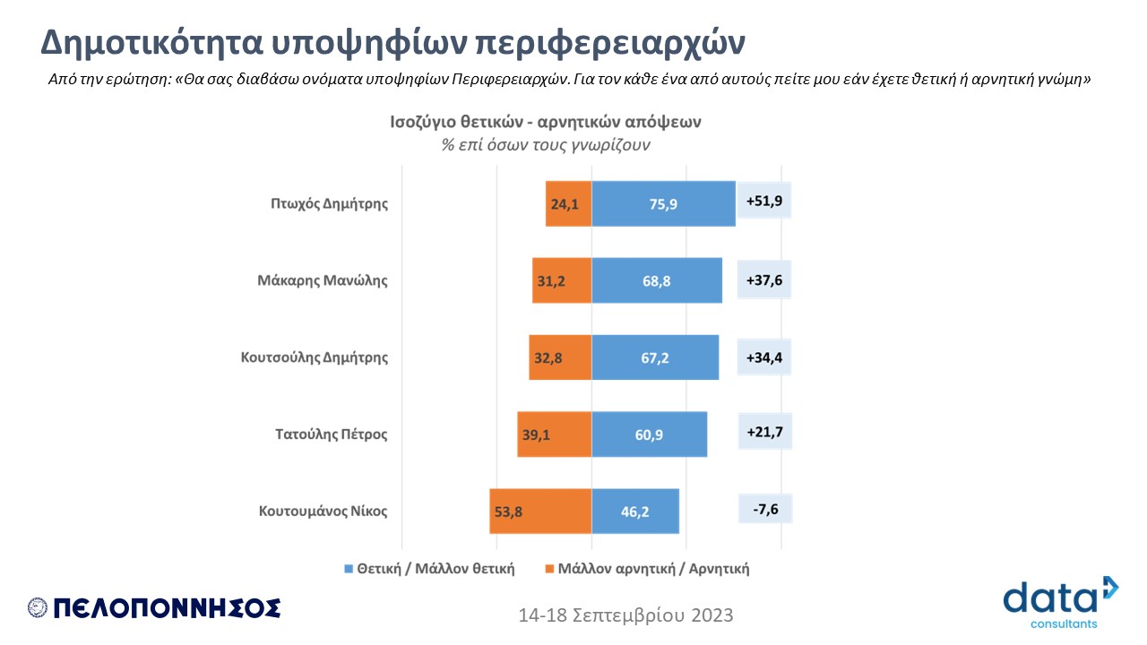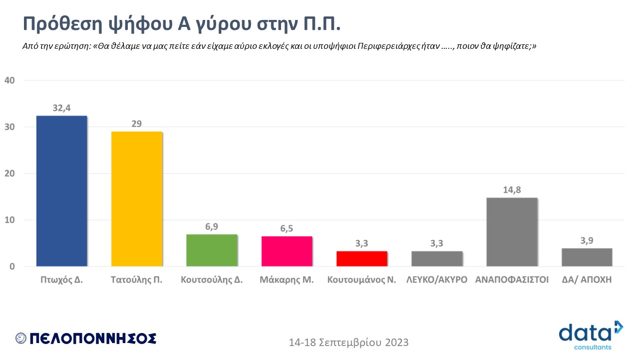 * Δύο εβδομάδες πριν τις εκλογές για Περιφερειάρχη η DATA C καταγράφει για δεύτερη φορά τις τάσεις στο εκλογικό τοπίο στην Περιφέρεια Πελοποννήσου, την δημοτικότητα των υποψηφίων και τις προθέσεις των ψηφοφόρων για στήριξη των υποψηφίων Περιφερειαρχών (Η πρώτη έρευνα δημοσιεύθηκε στην εφημερίδα ΠΕΛΟΠΟΝΝΗΣΟΣ στις 14/9/2023).