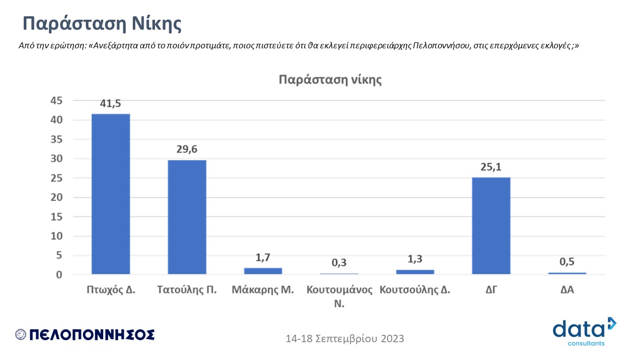 * Οι πολίτες της Περιφέρειας Πελοποννήσου σε ποσοστό 41,5% θεωρούν ότι θα κερδίσει τις εκλογές ο Δ. Πτωχός και μόλις σε ποσοστό 29,6% ότι θα κερδίσει ο Π. Τατούλης.