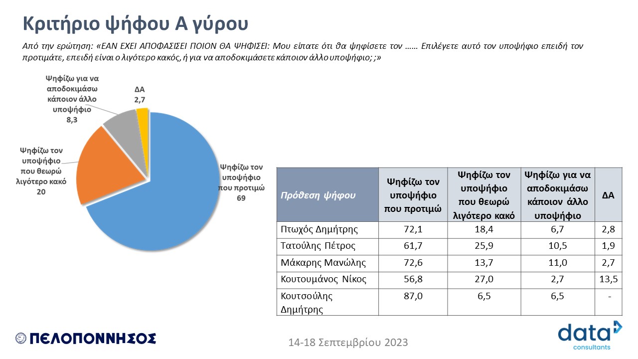 * Ρωτήθηκαν οι ψηφοφόροι εάν ο υποψήφιος που δήλωσαν πρόθεση να ψηφίσουν θα τον ψηφίσουν επειδή τον προτιμούν, επειδή τον θεωρούν λιγότερο κακό από τους άλλους υποψηφίους ή επειδή θέλει να αποδοκιμάσει κάποιον άλλο υποψήφιο. Όπως προέκυψε το 69% επιλέγουν τον υποψήφιο περιφερειάρχη που προτιμούν αλλά υπάρχει και ένα 20% που επιλέγουν αυτόν που θεωρούν τον λιγότερο κακό. Τέτοιους ψηφοφόρους προσελκύουν περισσότερο ο Ν. Κουτουμάνος αλλά και ο Π. Τατούλης.