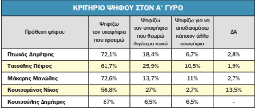Από την ερώτηση: «ΕΑΝ ΕΧΕΙ ΑΠΟΦΑΣΙΣΕΙ ΠΟΙΟΝ ΘΑ ΨΗΦΙΣΕΙ: Μου είπατε ότι θα ψηφίσετε τον …… Επιλέγετε αυτό τον υποψήφιο επειδή τον προτιμάτε, επειδή είναι ο λιγότερο κακός, ή για να αποδοκιμάσετε κάποιον άλλο υποψήφιο; ;»
