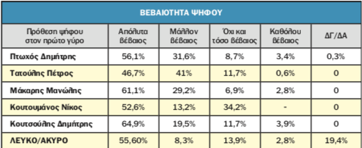 * Όπως προκύπτει, από όσους έχουν αποφασίσει ποιόν θα ψηφίσουν, μόλις το 53,9% είναι «απόλυτα βέβαιοι». Το 31,9% δηλώνουν «μάλλον βέβαιοι», το 11,1% «όχι και τόσο βέβαιοι» και το 2,2% «καθόλου βέβαιοι». Στον πίνακα 3 παραθέτουμε το βαθμό βεβαιότητας της πρόθεσης ψήφου ανά υποψήφιο που δήλωσαν ότι θα ψηφίσουν.