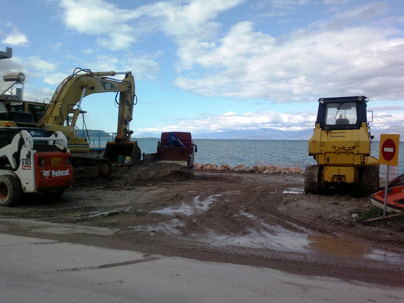 "Είναι μια σημαντική επέμβαση που πραγματοποιεί η Περιφέρεια Πελοποννήσου σε τμήμα του θαλασσίου μετώπου της πόλης Δερβενίου του Δήμου Ξυλοκάστρου – Ευρωστίνης. Στο τέλος του Φεβρουαρίου 2012 παρατηρήθηκε σε τμήμα της ακτογραμμής υποβιβασμός της επιφάνειας του βυθού, με άμεσο κίνδυνο κατάρρευσης οικιών και περαιτέρω επιδείνωση της αστοχίας. Η αντίδραση της Περιφέρειας Πελοποννήσου υπήρξε άμεση και αποτελεσματική. Η περιοχή εντός λίγων ημερών κηρύχθηκε σε κατάσταση έκτακτης ανάγκης και ταχύτατα έγινε η δημοπράτηση του έργου αποκατάστασης διαβρώσεων τμημάτων της Π.Ε.Ο. Κορίνθου – Πατρών από τη δράση του κυματισμού του Κορινθιακού Κόλπου. Είχε προηγηθεί η μελέτη αντιμετώπισης του φαινομένου και παρά το ότι κηρύχθηκε ευφυώς η περιοχή ως περιοχή έκτακτης ανάγκης, απαιτήθηκαν πάρα πολλές γραφειοκρατικές διατυπώσεις, πολλές εγκρίσεις και σχετικές αλληλογραφίες με τις Υπηρεσίες του Υπουργείου και με την Αρχαιολογική Υπηρεσία. Ακόμη απαιτήθηκε ο καθορισμός ορίων αιγιαλού και παραλίας, στο εν λόγω τμήμα, που δεν υπήρχε. Από το τέλος Σεπτεμβρίου 2013 συνεχίζονται οι εργασίες προς περαίωση του έργου.