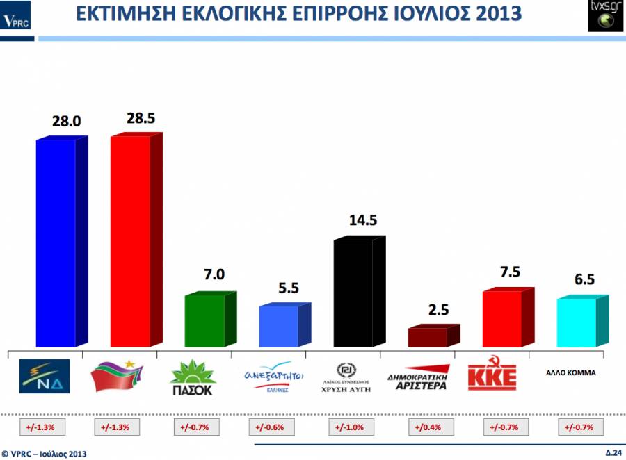 Τέλος, σε ένα περιβάλλον όπου η ανεργία φτάνει στο 27,4% του ενεργού πληθυσμού και η κοινωνική δυσαρέσκεια φαίνεται να διαχέεται , μόλις το 45% των ερωτηθέντων δηλώνουν εκλογική προτίμηση. Από αυτούς, στην εκτίμηση της εκλογικής επιρροής ο ΣΥΡΙΖΑ προηγείται οριακά της ΝΔ(0,5%) η οποία δείχνει να βελτιώνει ελαφρά την θέση της σε σχέση με την προηγούμενη δημοσκόπηση της Vprc, αντισταθμίζοντας τις συνεχιζόμενες απώλειες της προς τα δεξιά και την Χρυσή Αυγή, με κέρδη από τα αριστερά και την ΔΗΜΑΡ.