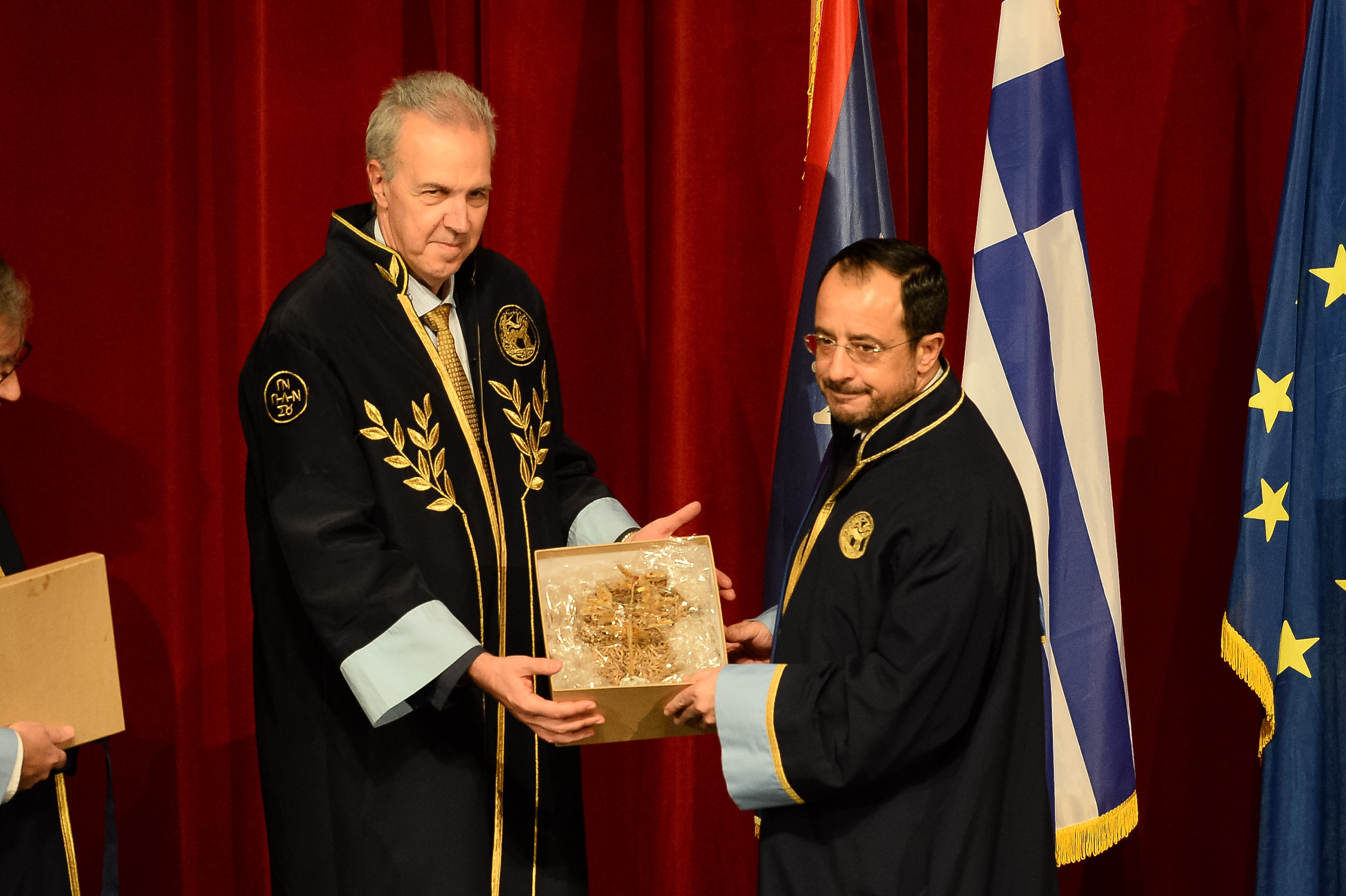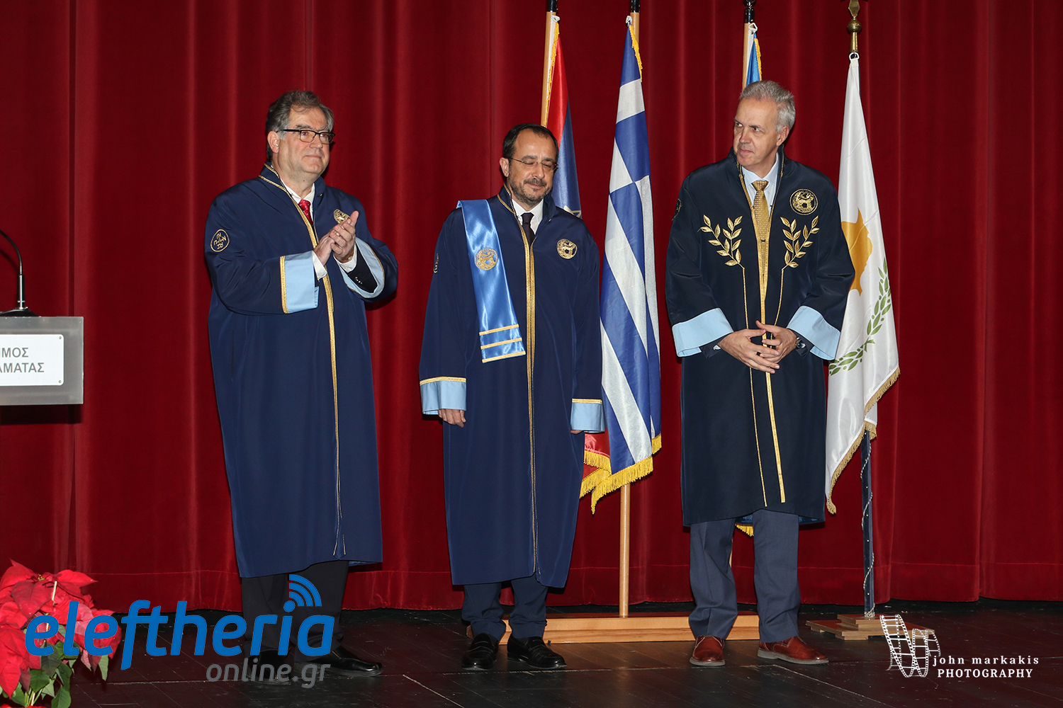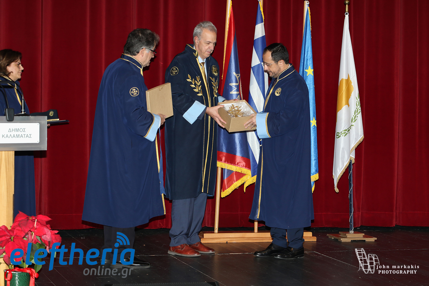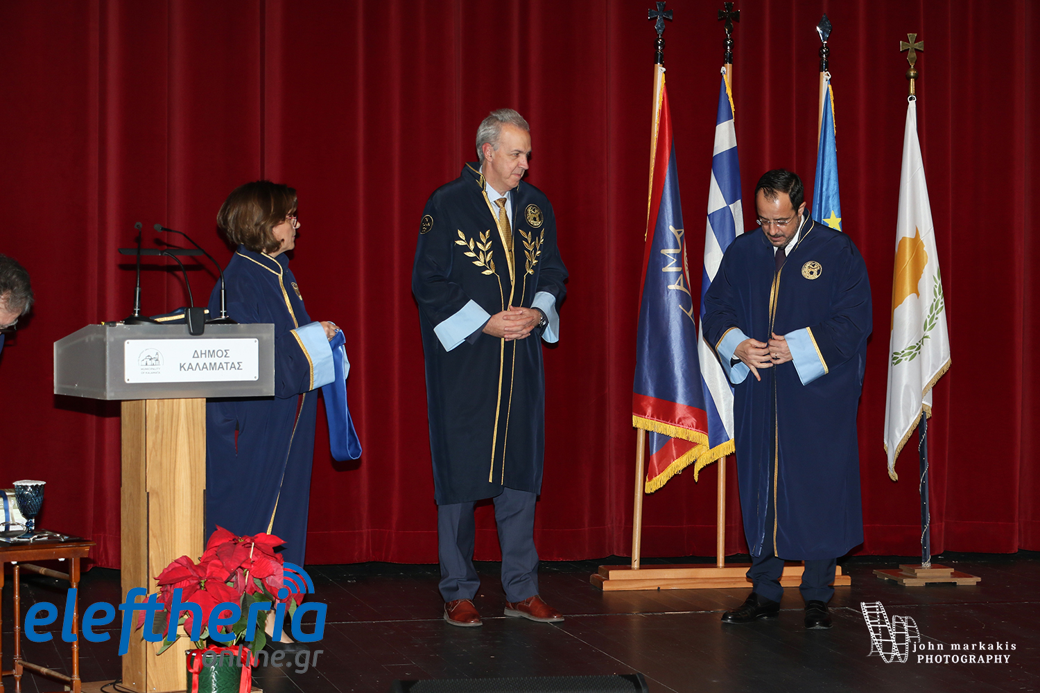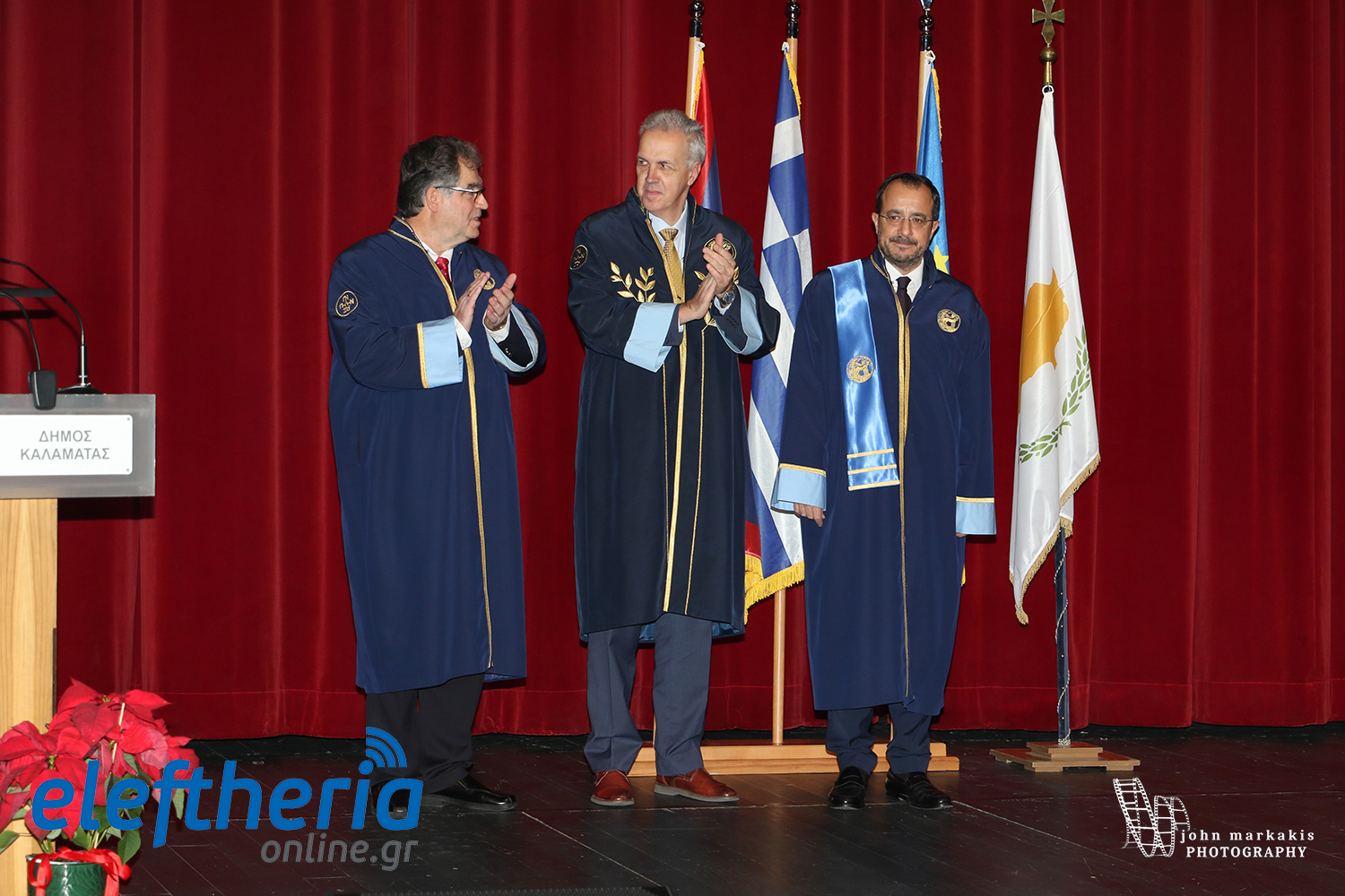 Πριν την τελετή ανακήρυξης προηγήθηκε η τελετή αναγόρευσης του κ. Χριστοδουλίδη σε επίτιμο διδάκτορα του Πανεπιστημίου Πελοποννήσου, μετά από ομόφωνη απόφαση του Τμήματος Ιστορίας, Αρχαιολογίας και Διαχείρισης Πολιτισμικών Αγαθών, που εδρεύει στην πόλη της Καλαμάτας.