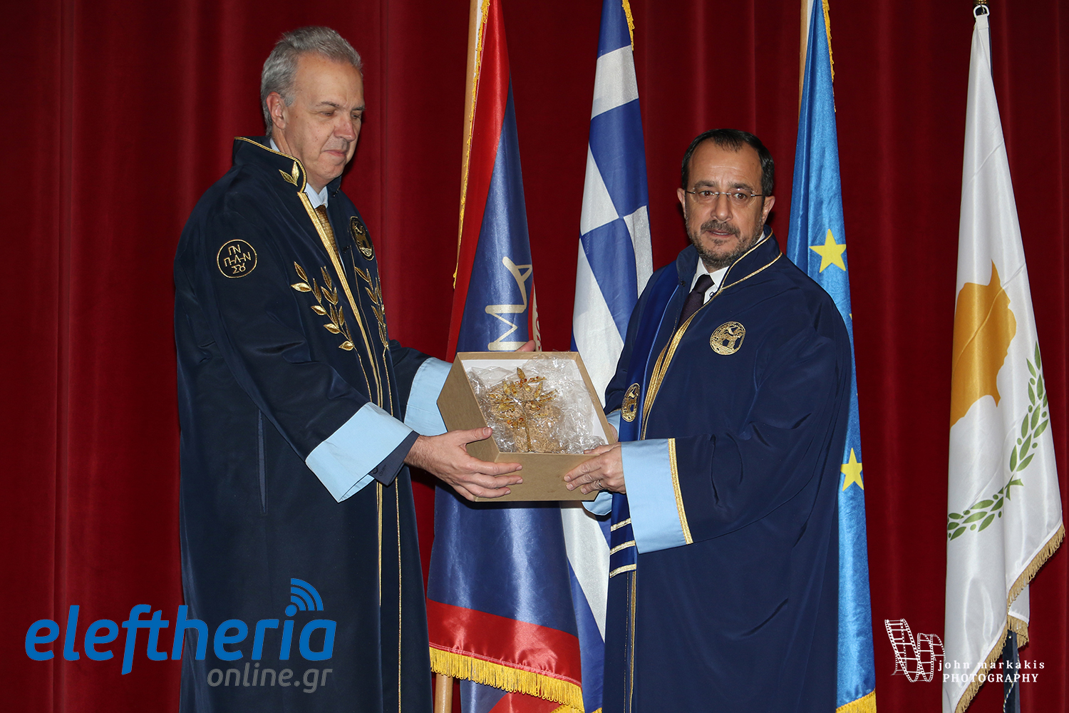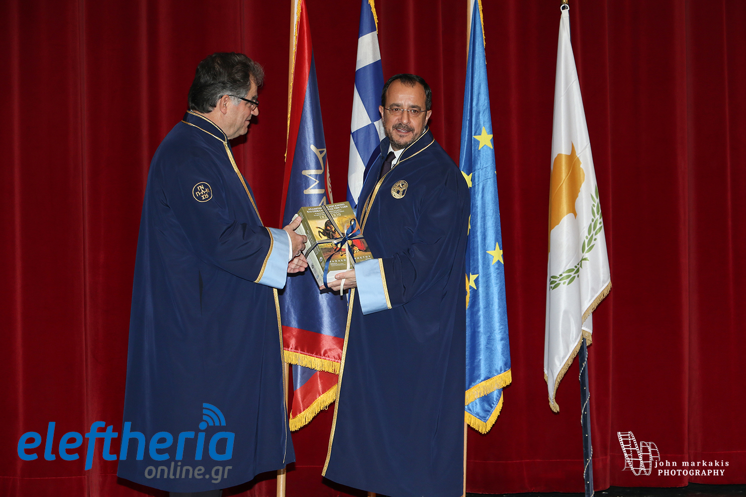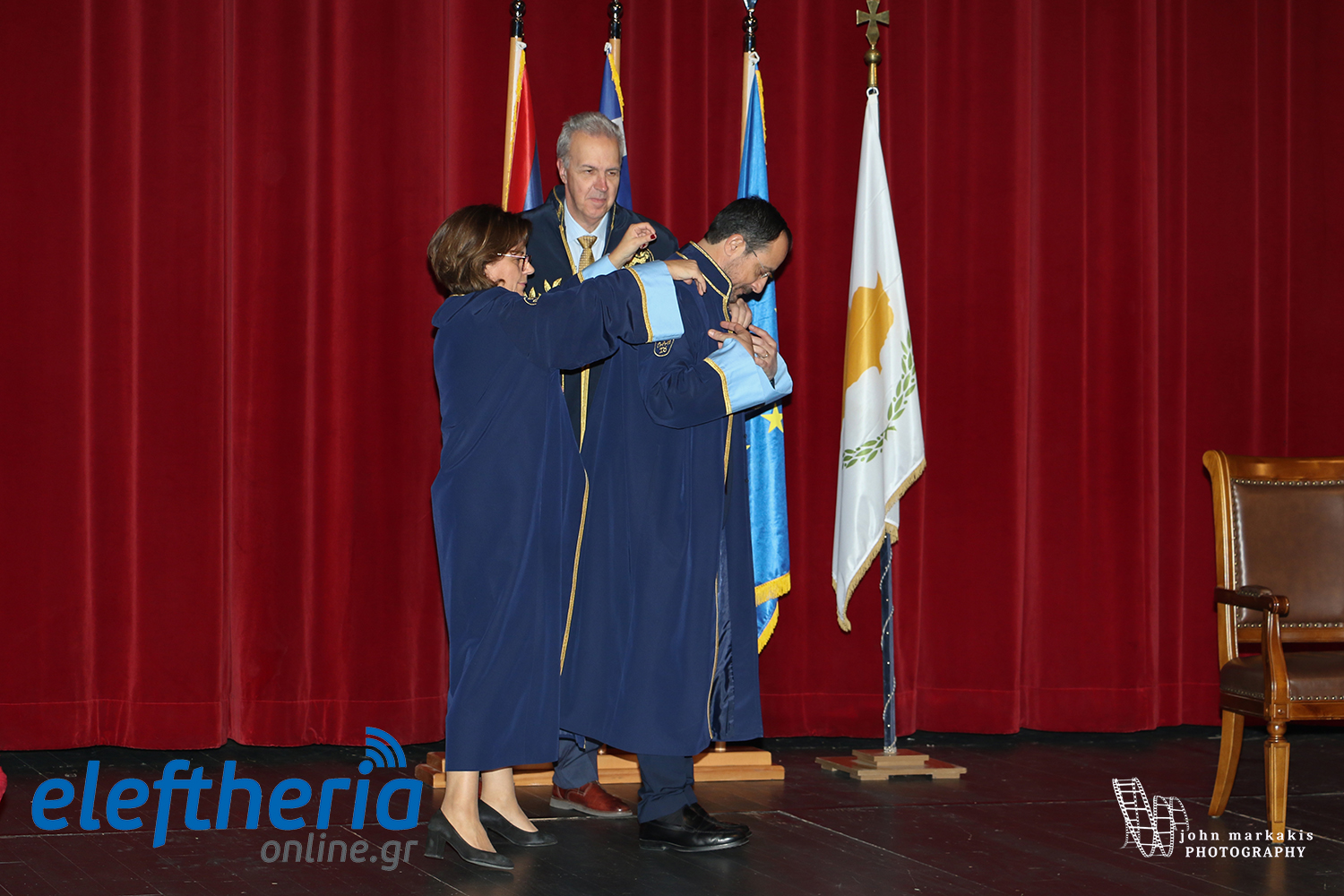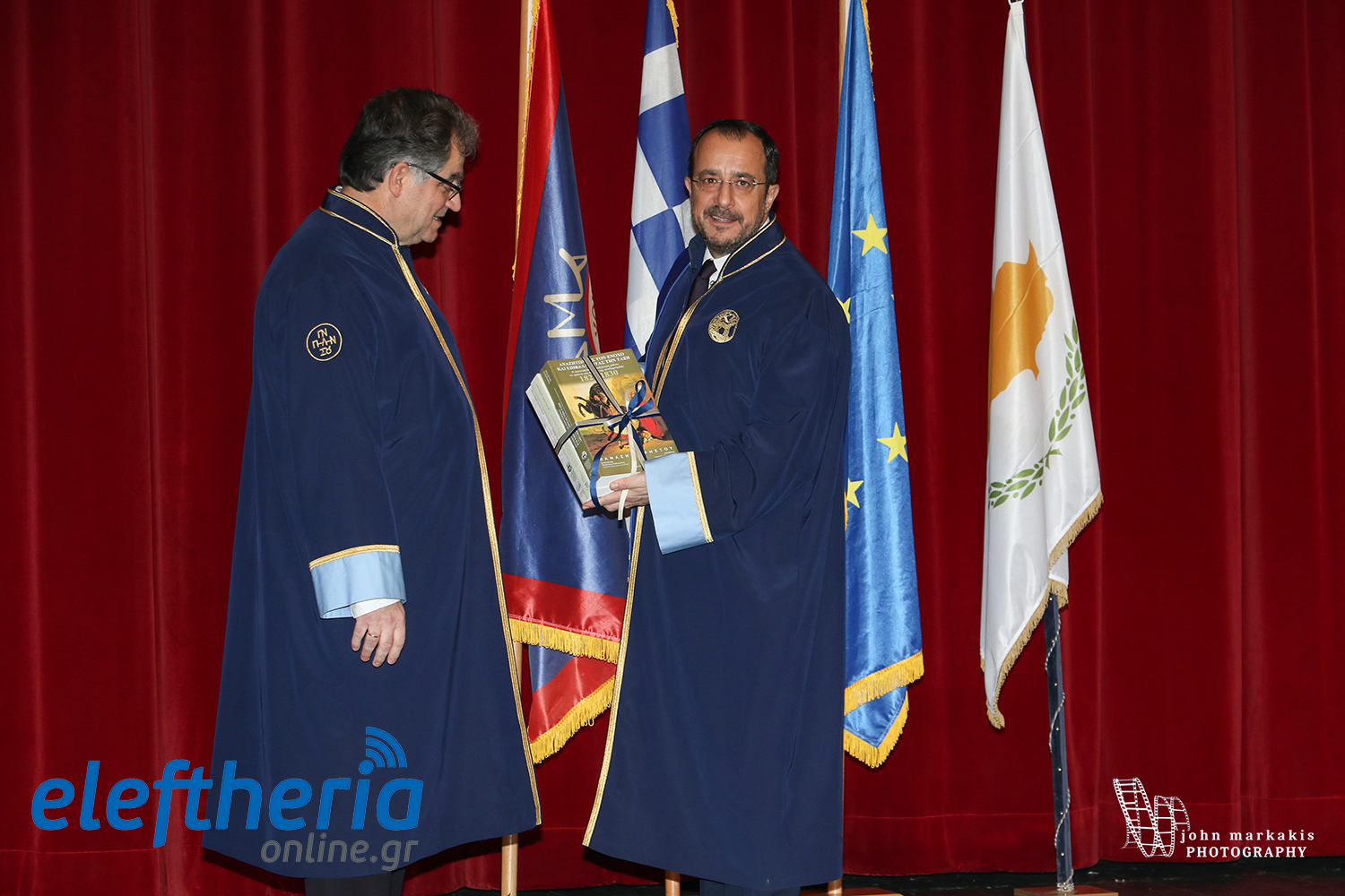 Πριν την τελετή ανακήρυξης προηγήθηκε η τελετή αναγόρευσης του κ. Χριστοδουλίδη σε επίτιμο διδάκτορα του Πανεπιστημίου Πελοποννήσου, μετά από ομόφωνη απόφαση του Τμήματος Ιστορίας, Αρχαιολογίας και Διαχείρισης Πολιτισμικών Αγαθών, που εδρεύει στην πόλη της Καλαμάτας.