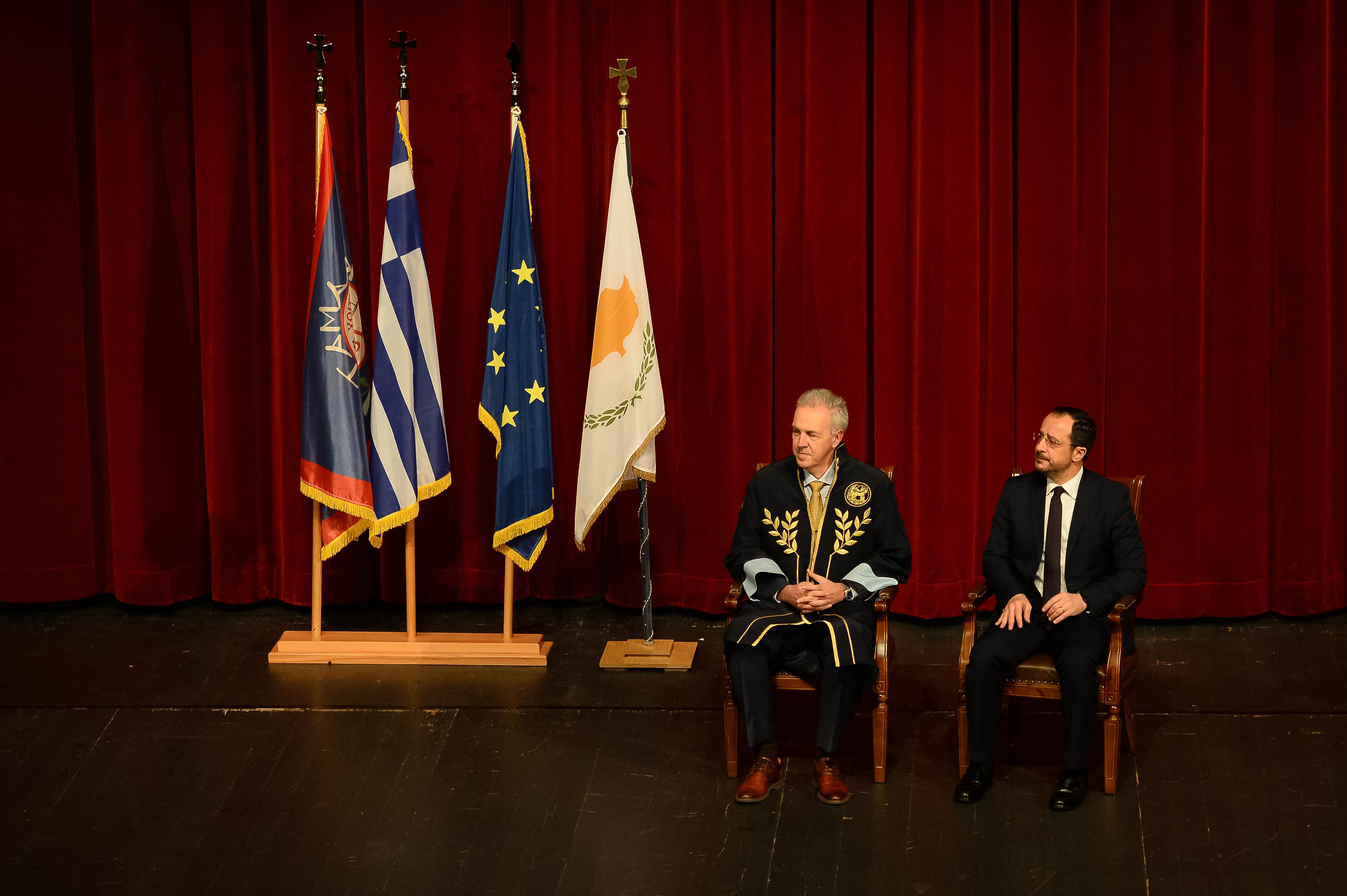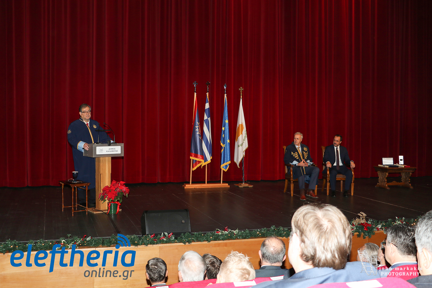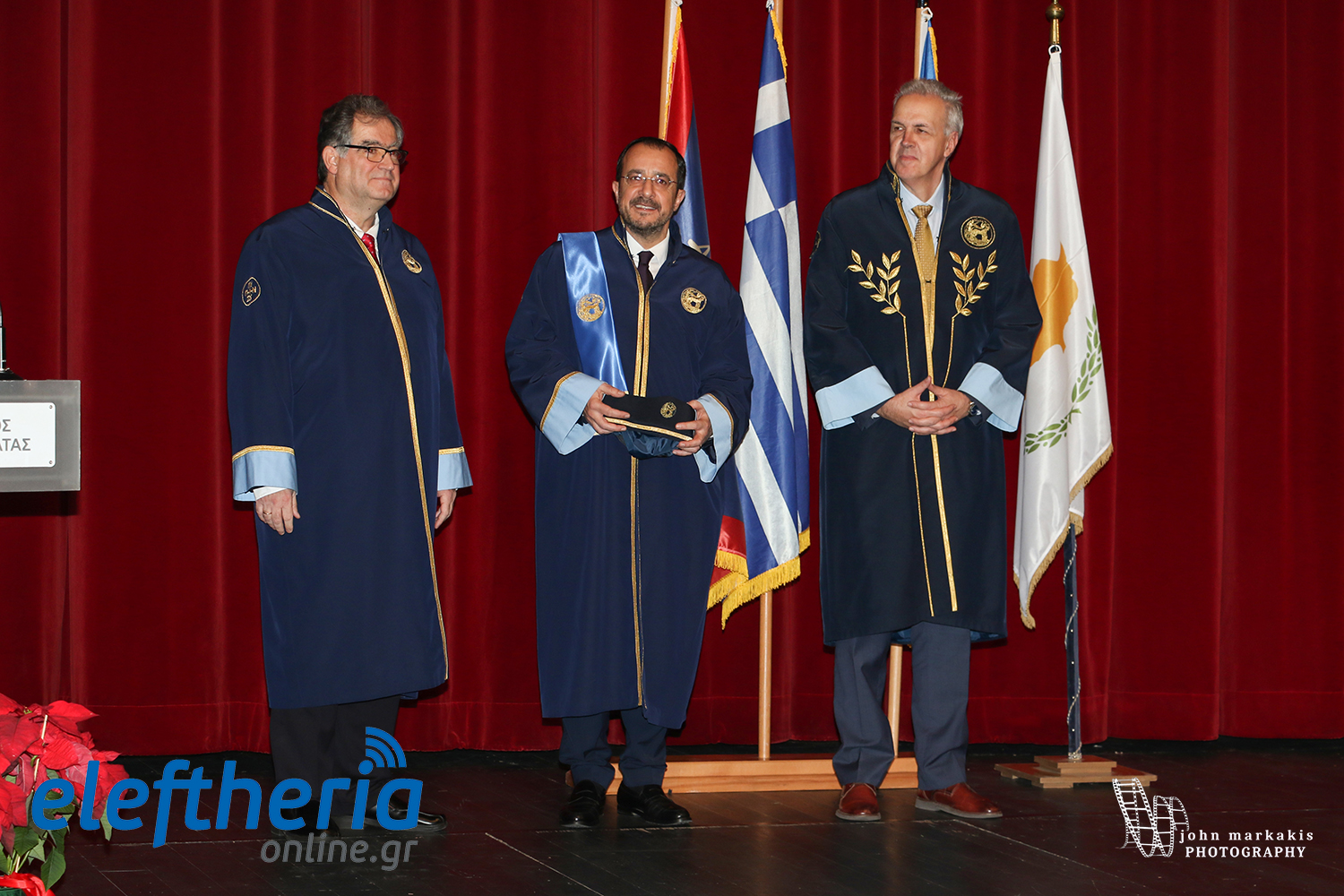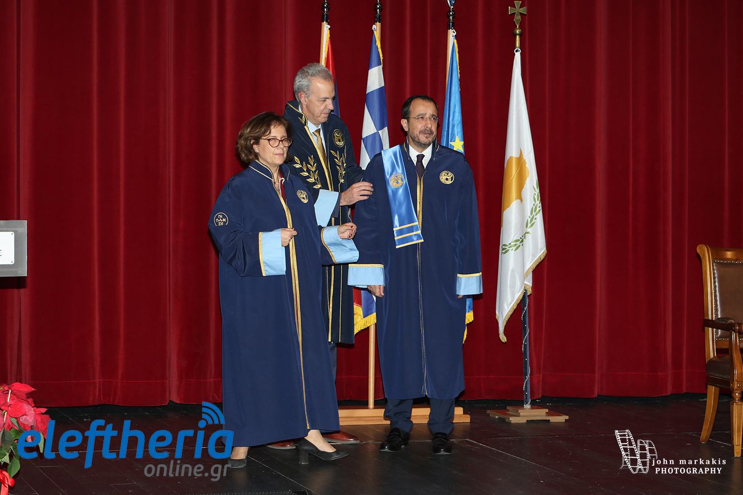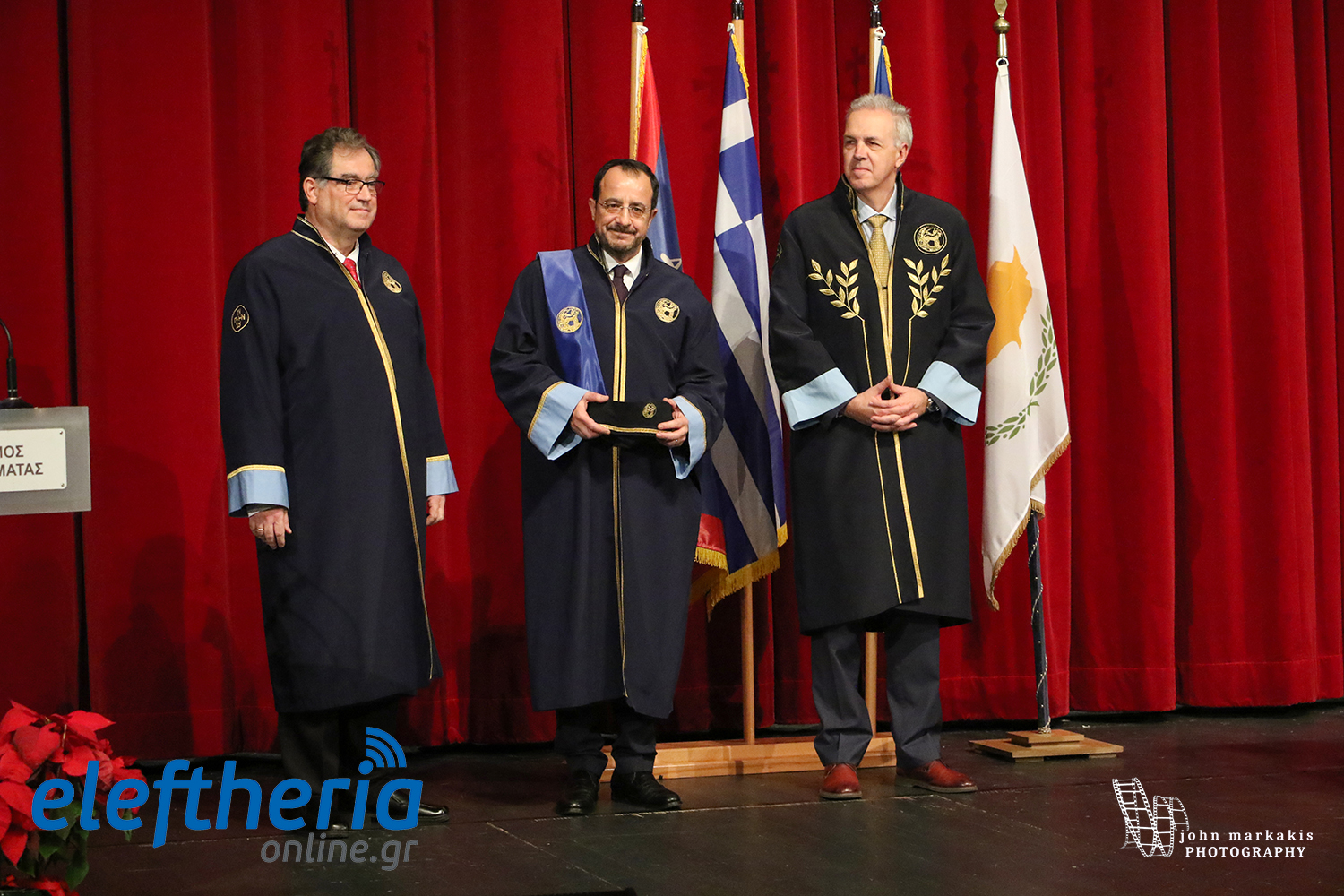 Πριν την τελετή ανακήρυξης προηγήθηκε η τελετή αναγόρευσης του κ. Χριστοδουλίδη σε επίτιμο διδάκτορα του Πανεπιστημίου Πελοποννήσου, μετά από ομόφωνη απόφαση του Τμήματος Ιστορίας, Αρχαιολογίας και Διαχείρισης Πολιτισμικών Αγαθών, που εδρεύει στην πόλη της Καλαμάτας.