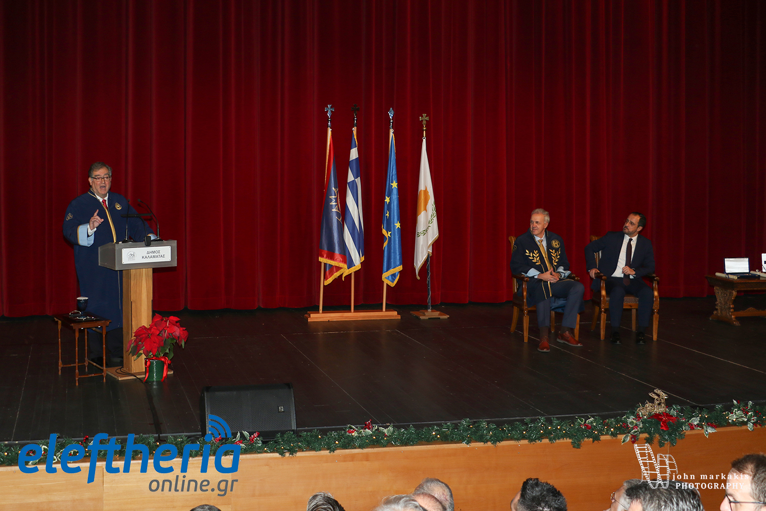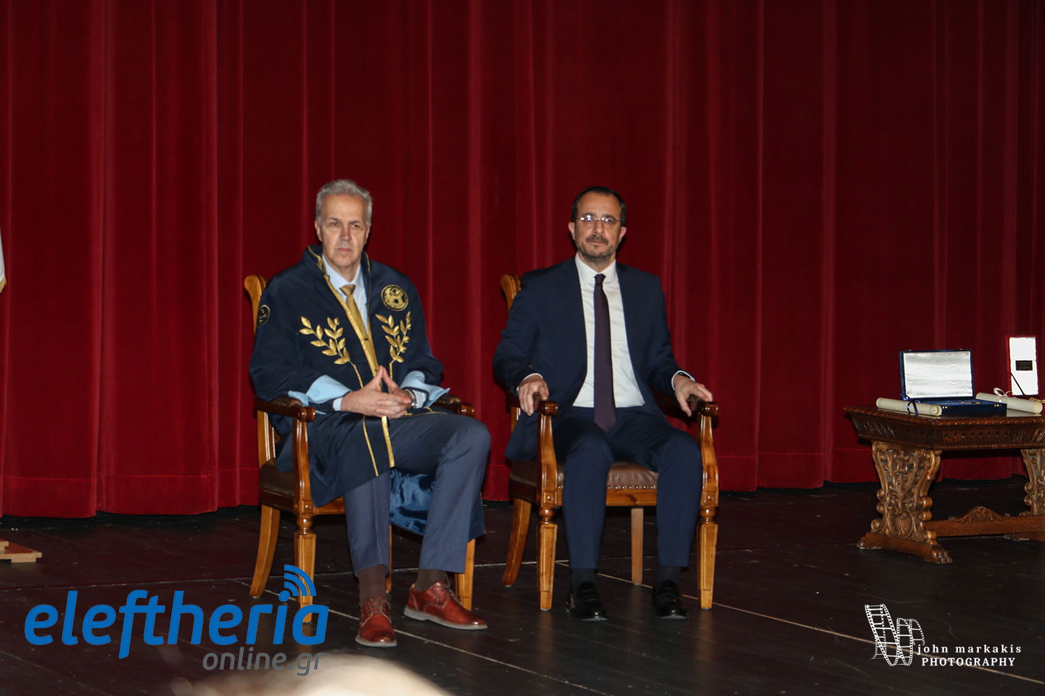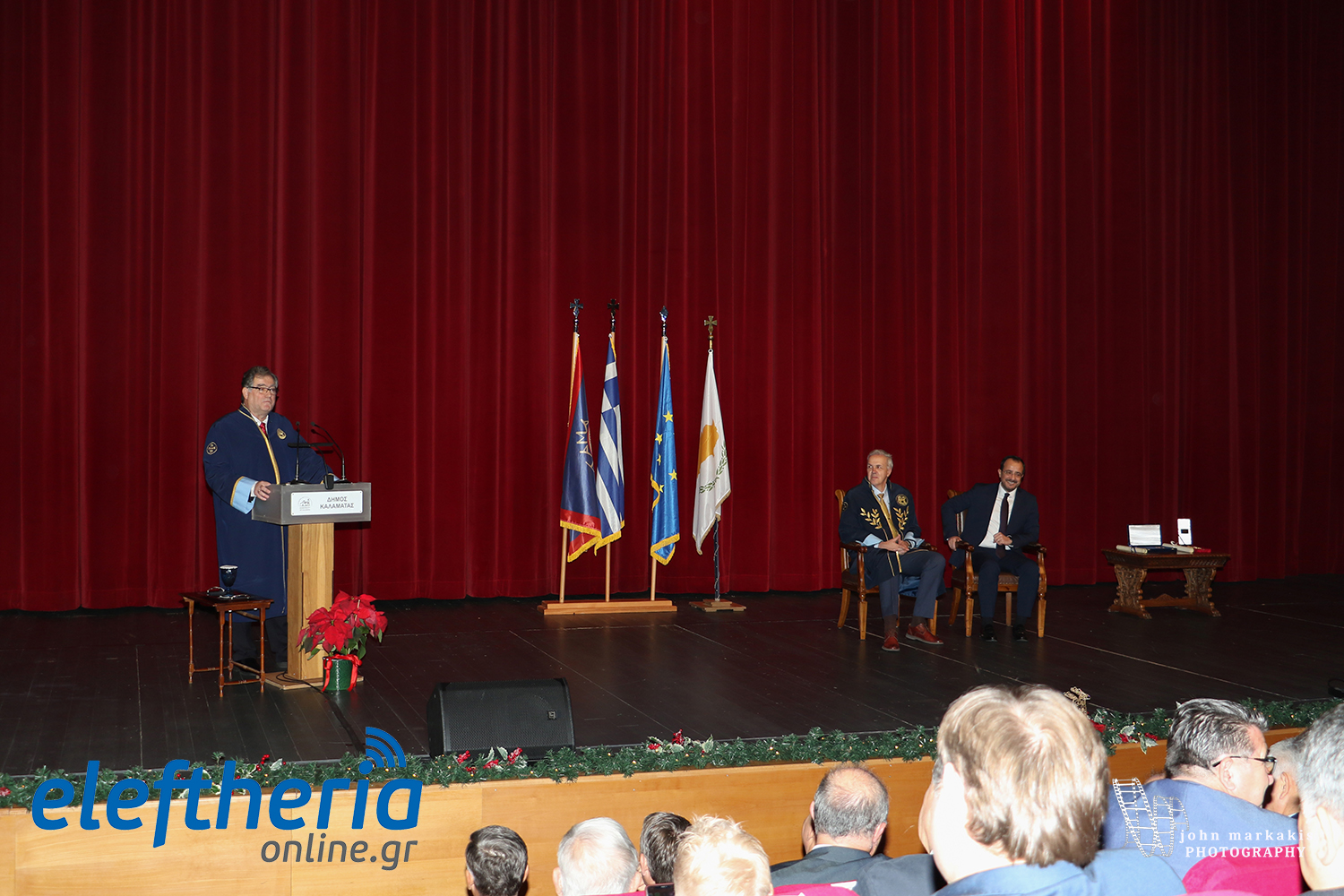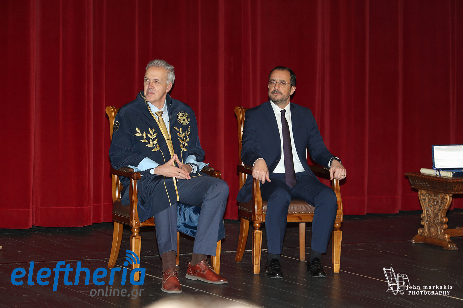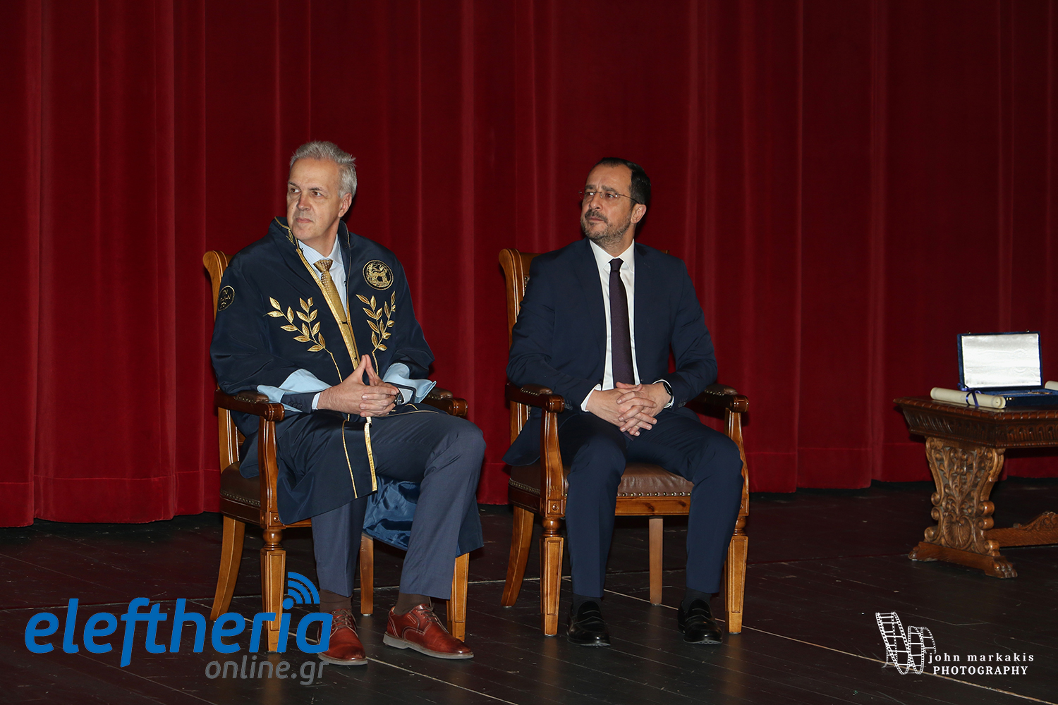 Πριν την τελετή ανακήρυξης προηγήθηκε η τελετή αναγόρευσης του κ. Χριστοδουλίδη σε επίτιμο διδάκτορα του Πανεπιστημίου Πελοποννήσου, μετά από ομόφωνη απόφαση του Τμήματος Ιστορίας, Αρχαιολογίας και Διαχείρισης Πολιτισμικών Αγαθών, που εδρεύει στην πόλη της Καλαμάτας.